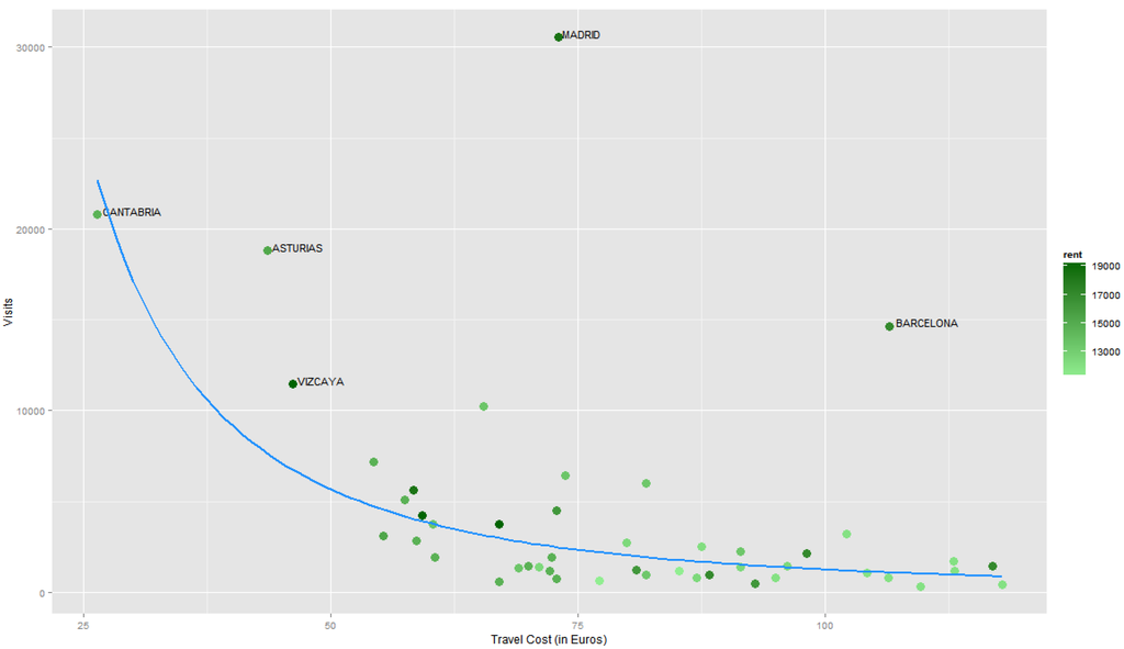 Two points are remarkable in Figure 5, Madrid and Barcelona. Asturias and Vizcaya could be mentioned as relevant, too, but they are not in the same range as the previous two regions. Due to the high population of Madrid and Barcelona, a major number of visitors come from these areas. The adjustment for the demand curve (Section 3.1) was much better, because the visitor rate per total population of the area was used in that case. The parameters in this new adjustment are significant anyway, but the existence of these outliers implies an under-estimation of the final value of the cave as many more visitors than estimated will reach the site from these areas. A rapid estimation of this loss of value shows an amount of 3,268,000 euros per year, but the use of this enlarged amount is not followed, as it appears to be unrealistic.