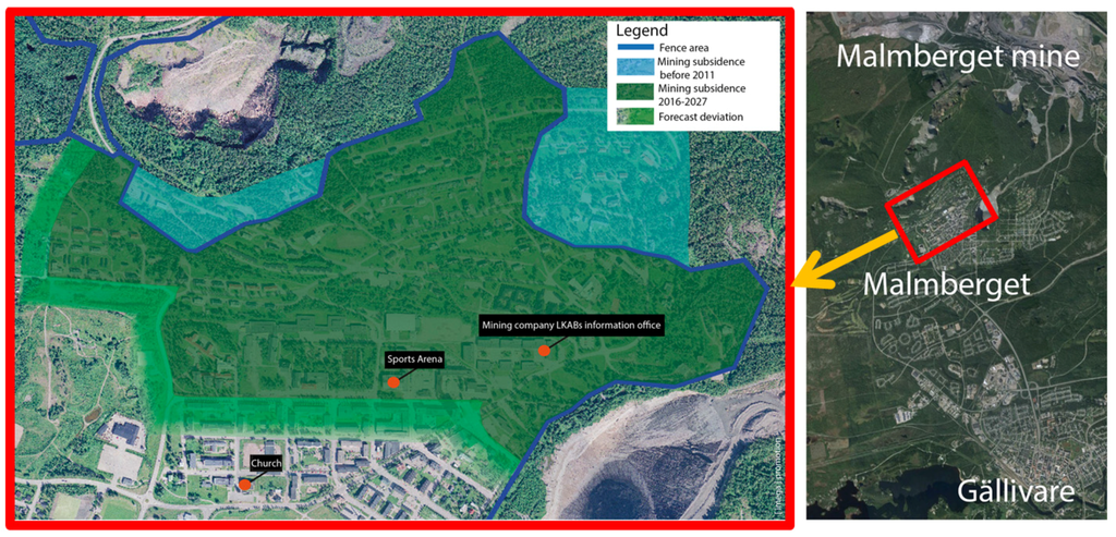 The location of mining subsidence zones in Malmberget. Buildings and roads within these zones are going to be demolished or relocated. The blue line on the left picture shows the fence area, the light blue area shows mining subsidence before 2011, and the dark green area shows predicted mining subsidence in 2016–2027 with forecast deviation shown in light green.
