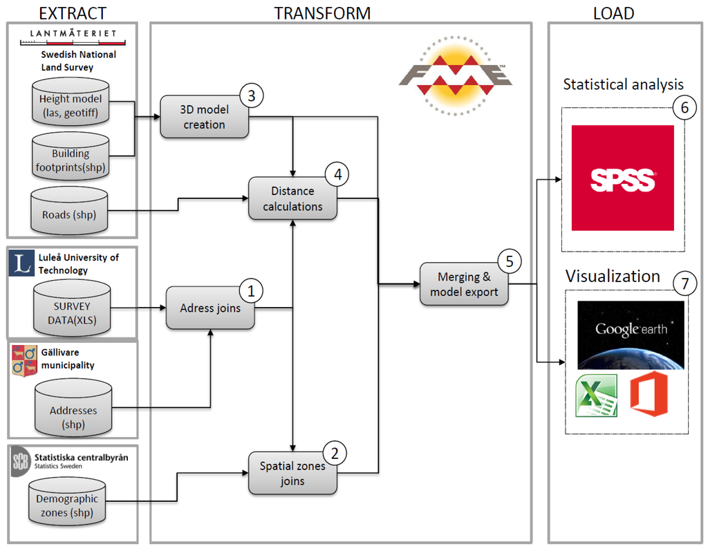The Feature Manipulation Engine (FME) developed by Safe Software was used for integrating the data. It is specifically designed for extracting, transforming and loading (ETL) data and can manage the exchange of spatial and non-spatial data in more than 300 formats [41,42]. The ETL based process method is show in Figure 2 and consists of the following steps.