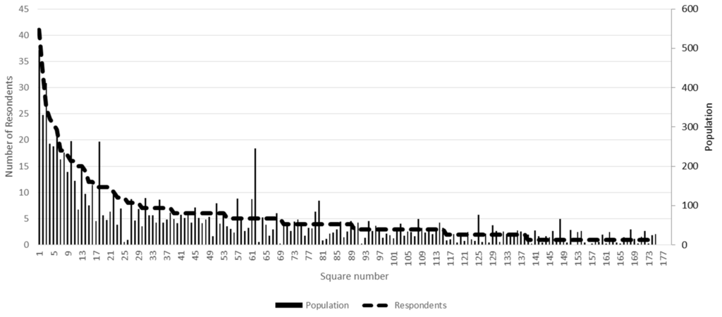 Total population in the 20–80 year age range (right y-axis) and numbers of respondents (left y-axis), aggregated in 250 m × 250 m squares.