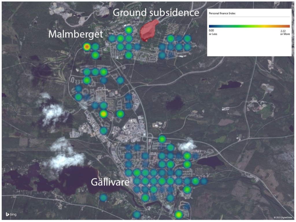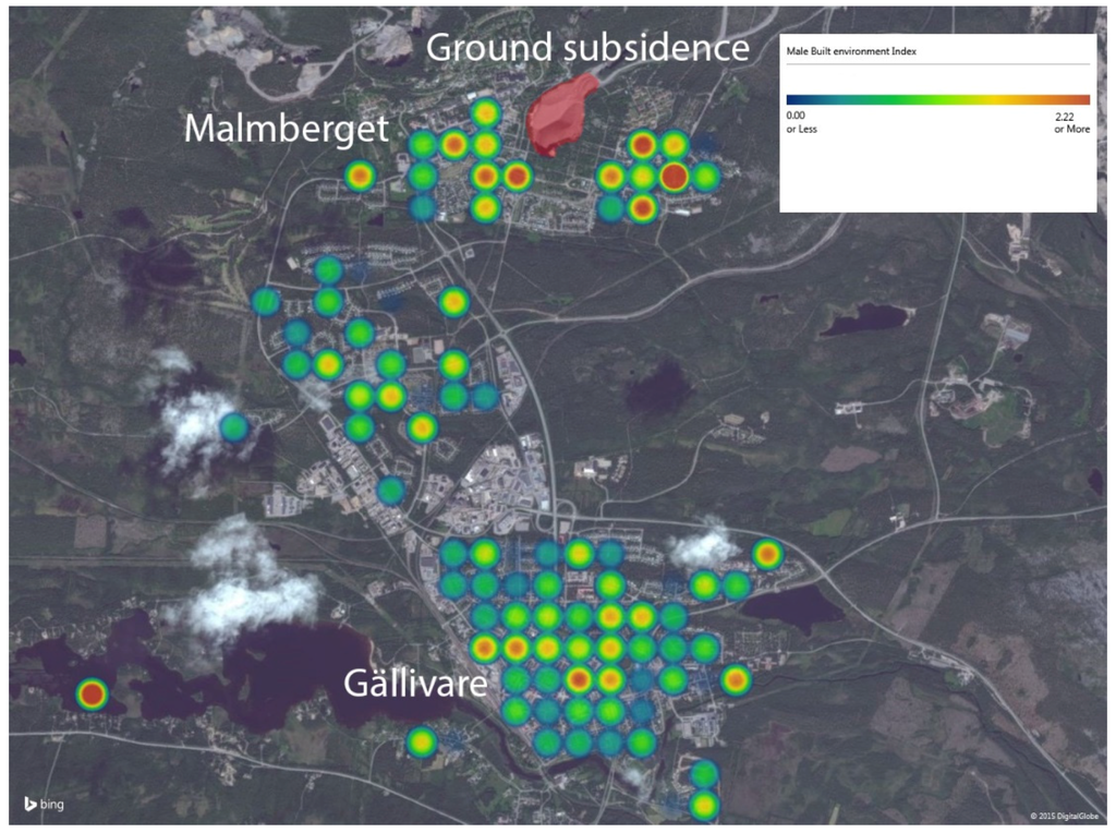 In the context of Gällivare and Malmberget, examples show that there is a distinct dissatisfaction with the built environment close to the mining pit, but an even more pronounced pattern is the strong spatial overlap of dissatisfaction with the built environment and personal financial situation. The difference between women’s and men’s satisfaction with the built environment in the center of Gällivare can be visualized but not explained through the presented model.