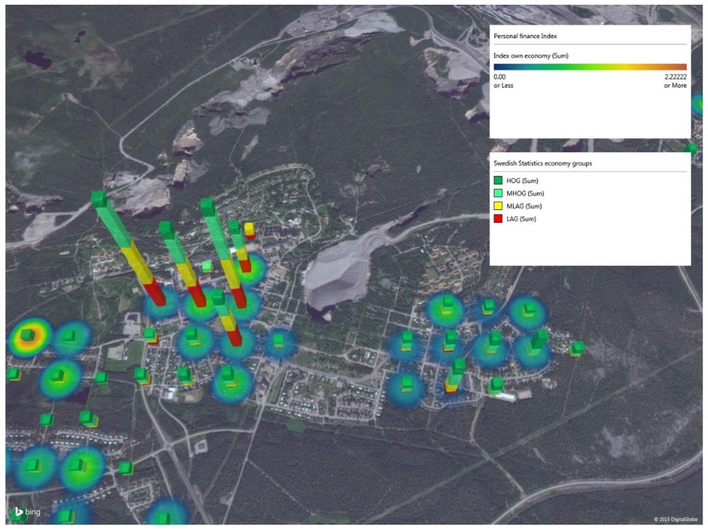 Heatmap of Personal finance scores and 3D chart of SCB income groups in 250 m × 250 m squares in the center of Malmberget (red lowest, yellow low, light green medium and dark green high).