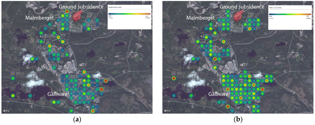The presented model displays aspects of social sustainability in Gällivare municipality, such as distributions of resources operationalized through national and locally gathered statistics, together with citizens’ perceptions of their financial status, built environment, social inclusion, and provision of public services, as measured by indices based on several variables. The results show that citizens were most dissatisfied with the Built environment, and scores for this index were most strongly spatially distributed, confirming findings by Jakobsson and Segerstedt [40] that this was the strongest motivator for people wanting to leave the municipality. They also show that Personal finance scores were spatially correlated with several other perceptions of the respondents in different areas. Thus, these indices visualized in heatmaps may be particularly useful for urban planners engaged in social sustainability analysis, politicians and other decision-makers to identify possible urban planning issues at early stages. The model alone cannot provide robust guidance for redesigning areas, as it provides little indication of some of the factors influencing citizen’s attitudes. Nevertheless, such visualization can be helpful for identifying spatial areas to focus upon in qualitative and interactive collaboration processes between citizens and professional stakeholders such as urban planners, traffic planners, and decision-makers. The application of the model presented here shows, for instance, areas where satisfaction with the built environment and social inclusion are lowest, which could guide interactive processes that assist interpretation of the social values visualized by the model.