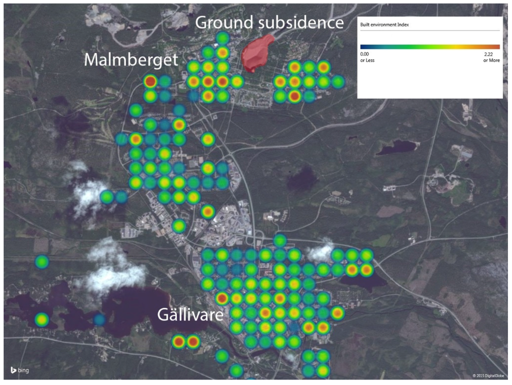 Heatmap showing Built environment scores in 250 m × 250 m squares of the two city centers Malmberget and Gällivare and the area affected by ground subsidence caused by the mine.