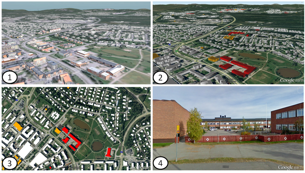 Such interactive processes, mediated through various kinds of meetings and media, can improve qualitative understanding, using 3D models as points of departure. Figure 13 (1–4) shows an example of a public building, a school, located in a residential area where dissatisfaction with the built environment is high. To obtain insights into such dissatisfaction, similar pictures like Figure 13 (4) taken by citizens or other participants in planning dialogues could be used to start discussions and enhance the inclusiveness of urban design processes.
