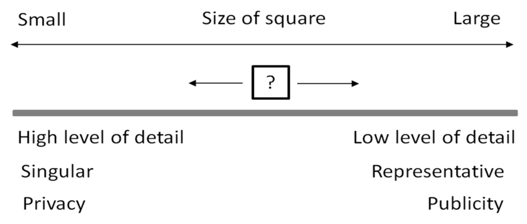 Effects of size of the geographical units (here squares) on the level of detail, representativity and privacy in analyses such as this.