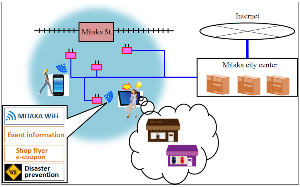 In this study, four Wi-Fi access points were set at a bus rotary to cover the area around Mitaka station. The portal site of this Wi-Fi experiment counted the number of users from the access logs. This study also encouraged the shops in the Wi-Fi area to advertise themselves using electric advertisements and electric coupons in the portal site. The impact of advertisements was assessed by the number of shop visitors before and after the study by conducting questionnaires at each shop. A disaster prevention drill was also virtually simulated. The portal site was switched to emergency mode by triggering a sensor function. The number of participants in the drill was counted via the access logs. The efficiency of the drill was measured from questionnaire results.
