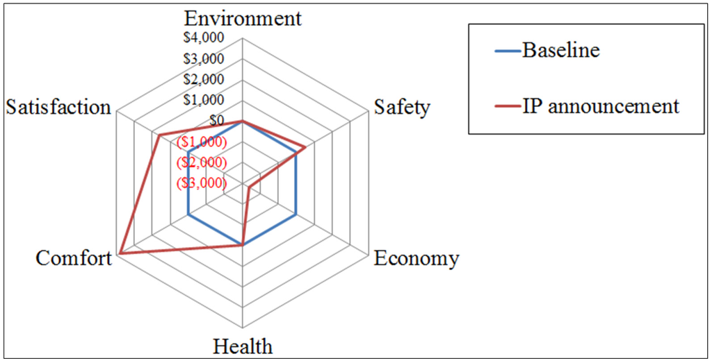 Figure 5 shows the estimated impact of IP announcements based on the second layer of the proposed KPIs and the baseline defined as status quo. Compared with the baseline, IP announcements were expected to offer the largest improvement in comfort, as much as $4000, with the second largest improvement in satisfaction, around $2000. The estimated value for safety improvement was less than $1000; insignificant compared with comfort and satisfaction. On the other hand, the estimated negative value on the economy was nearly $3000, whereas the negative value on environment was negligible compared to the economy value and other positive values. This means that IP announcements significantly impacted comfort, economy, and satisfaction. In addition, the summation value of all KPIs was around $3000 in the positive. This result suggests that IP announcements have a positive impact of as much as $3000 per year from the viewpoint of the triple bottom line.