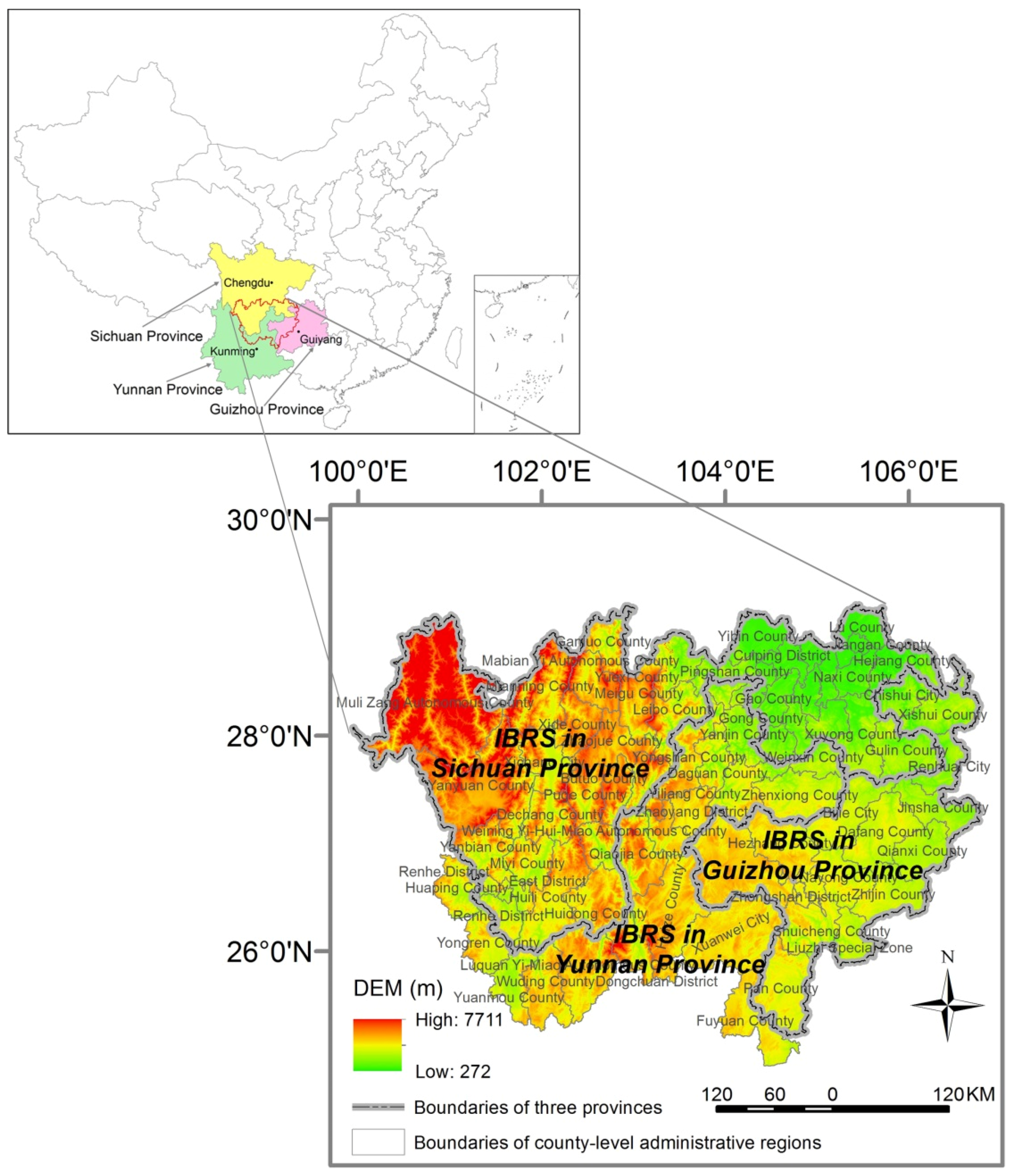 Thus, by and large, the economic disparities of underdeveloped regions and small-scale regions, as well as multiscale research, have not received sufficient attention. For instance, mountain areas and interprovincial boundary regions (IBR) have rarely been mentioned. An IBR is a specific geographical region composed of the juncture of two or more provinces [47]. In China, 849 counties (or cities), accounting for 39% of the county-level administrative regions of the country, are distributed along the two sides of 5200 km provincial land administrative boundary line [48]. Because they are far away from provincial centers and the administrative boundary limits the diffusion of economic activities, almost every IBR in China has consistently been a marginal region of investment and economic development even in the market economy period [49]. Moreover, analyzing the economic disparity of small-scale [50] and multi-scale regions is considered to be helpful in approaching the regional development reality and benefit to find the driving forces behind. Mountains of southwest China (Sichuan, Yunan and Guizhou Province) are one of the country’s most important mountain areas because of natural resources. The IBR of Sichuan-Yunnan-Guizhou (IBRS) is the mineral resource core of mountains of southwest China. Moreover, as the “Western Development Strategy” entering into the promotion stage and the Yangtze River Economic Belt (YREB) Development Strategy was promoted [51,52], the IBRS has become one of the most dynamic and high-focus regions in China. Being both mountains and IBR, the IBRS has to be faced with tremendous pressure of economic development.