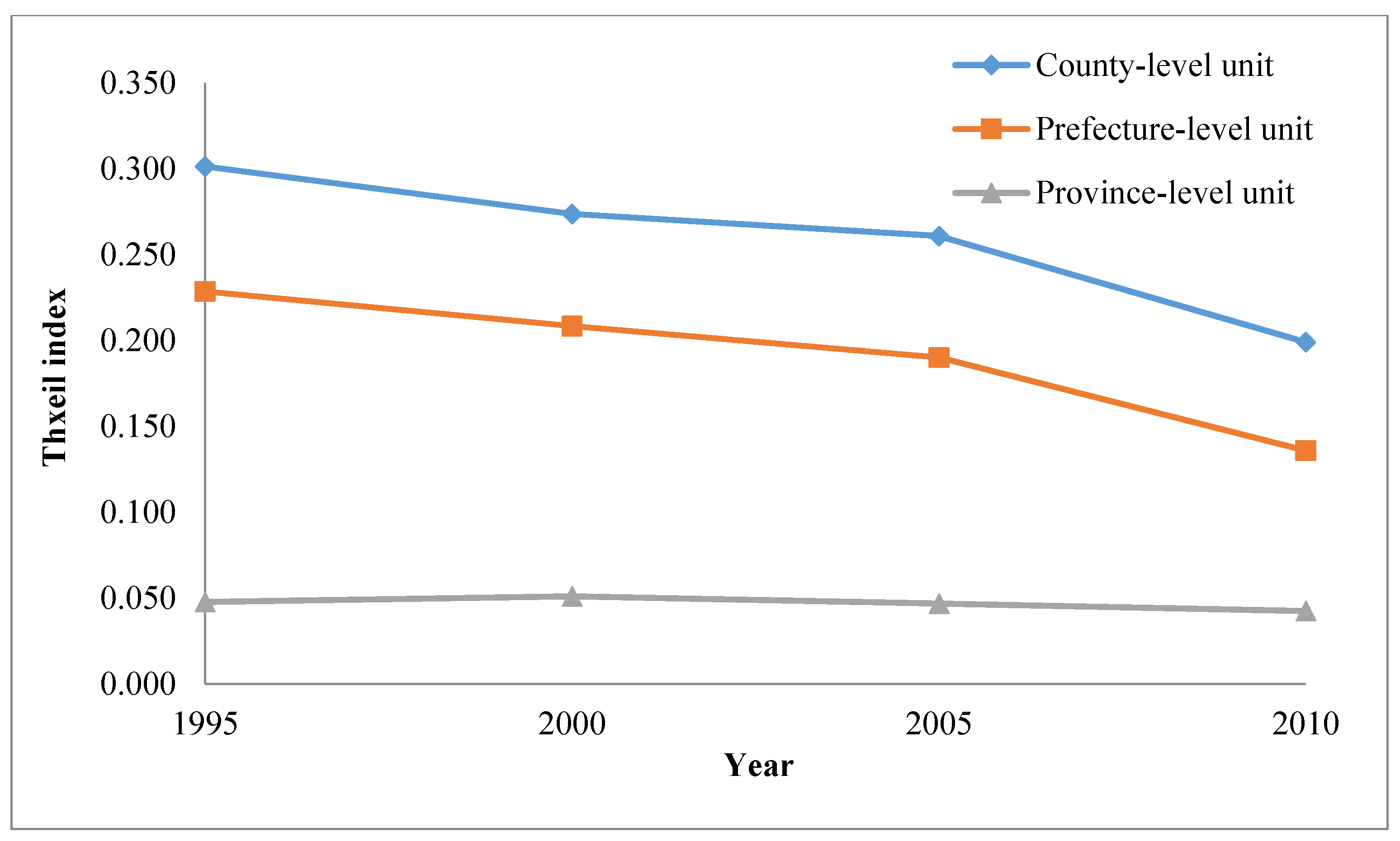 In addition, it should be noted that although GDP per capita is the main indicator to measure economic development, China’s GDP accounting started in 1985 and the accounting methods of county-level administrative regions were not uniform, which resulted in difficulty in data collection, especially in 1995. For instance, the difference in standard of population statistics (registered permanent residence or resident population) in 1995 would impact data accuracy. Nevertheless, the main purpose of our study is to explore the dynamic trend and disparity of economic development. Consequently, those data quality issues could hardly produce effects on the research results.