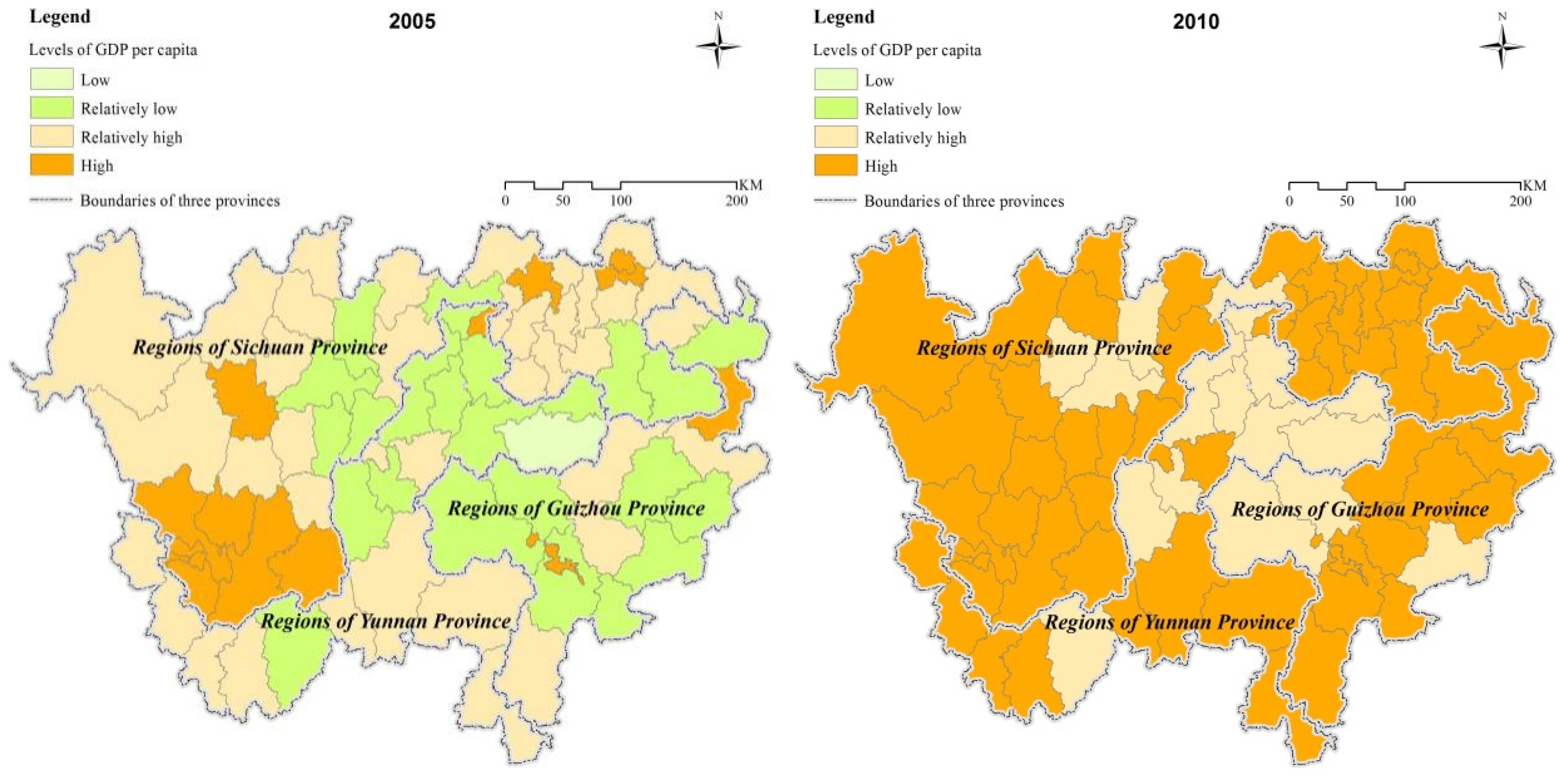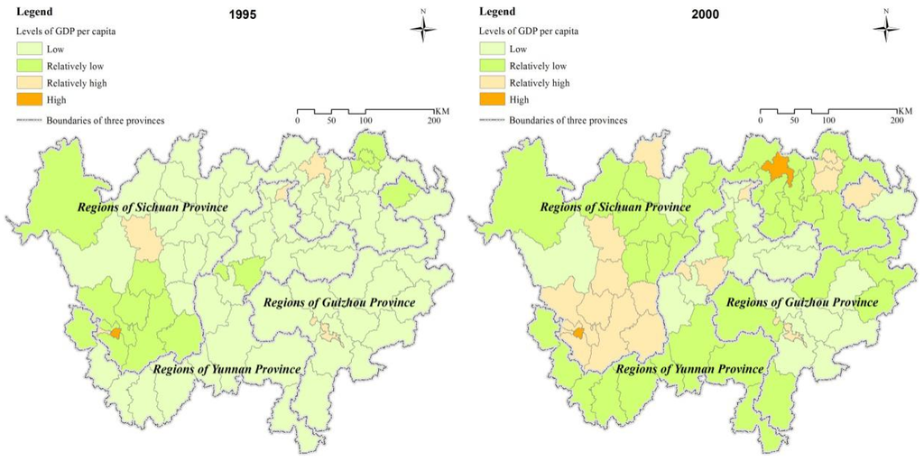 Data for this study mainly includes GDP per capita (comparable price), boundary (shapefile format) and digital elevation model (DEM). According to [50], county economy plays an important role in the government’s decision-making and macro-control. Taking into account the analysis scale and the accessibility of data, we made use of county-level data to conduct the research. GDP per capita for each county in the years 1995, 2000, 2005 and 2010 were obtained primarily from Sichuan Statistical Yearbook [55,56,57,58], Yunnan Statistical Yearbook [59,60,61,62] and Guizhou Statistical Yearbook [63,64,65,66]. Boundary information and DEM with resolution of 90 m were got from National Geomatics Center of China.
