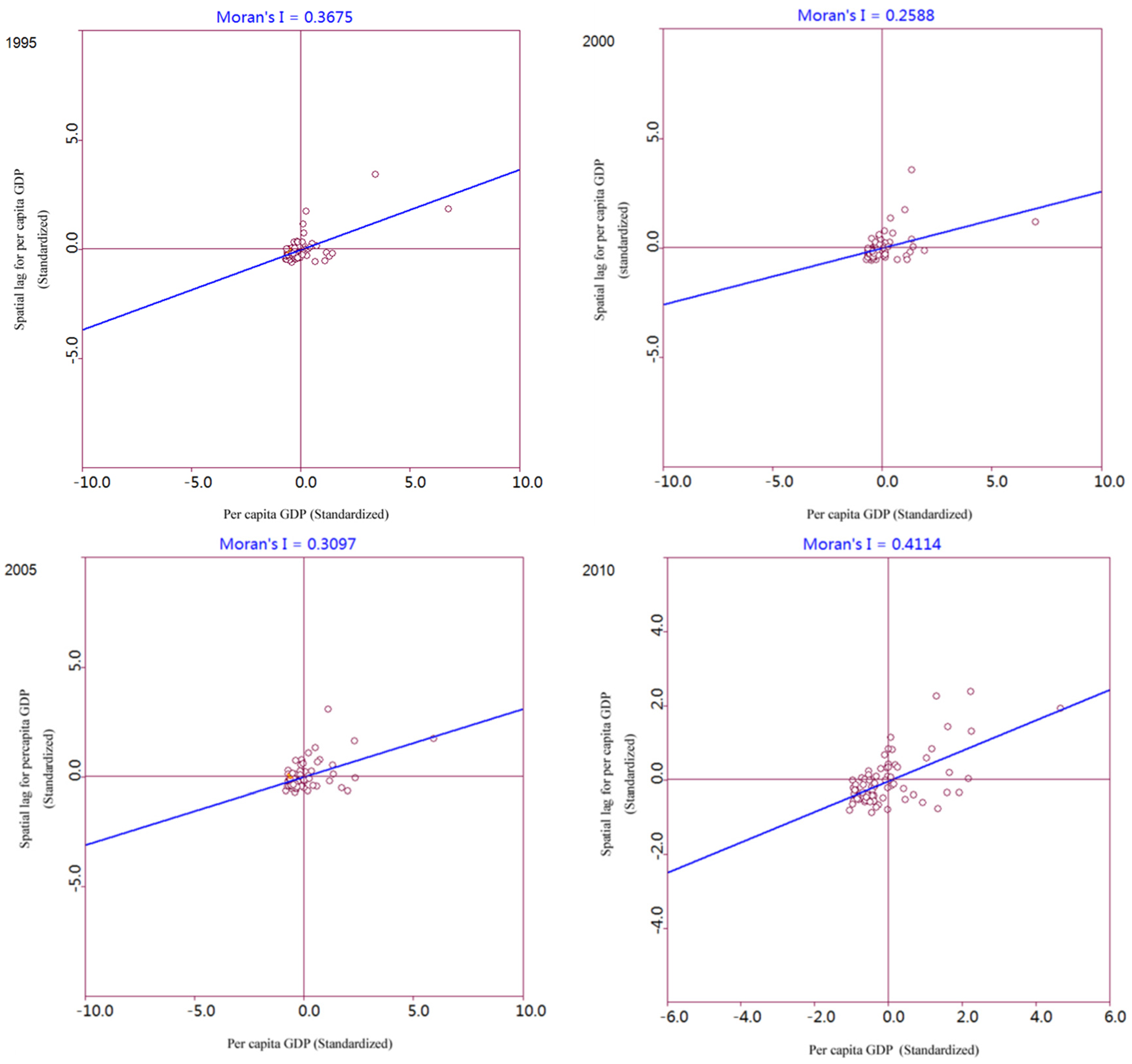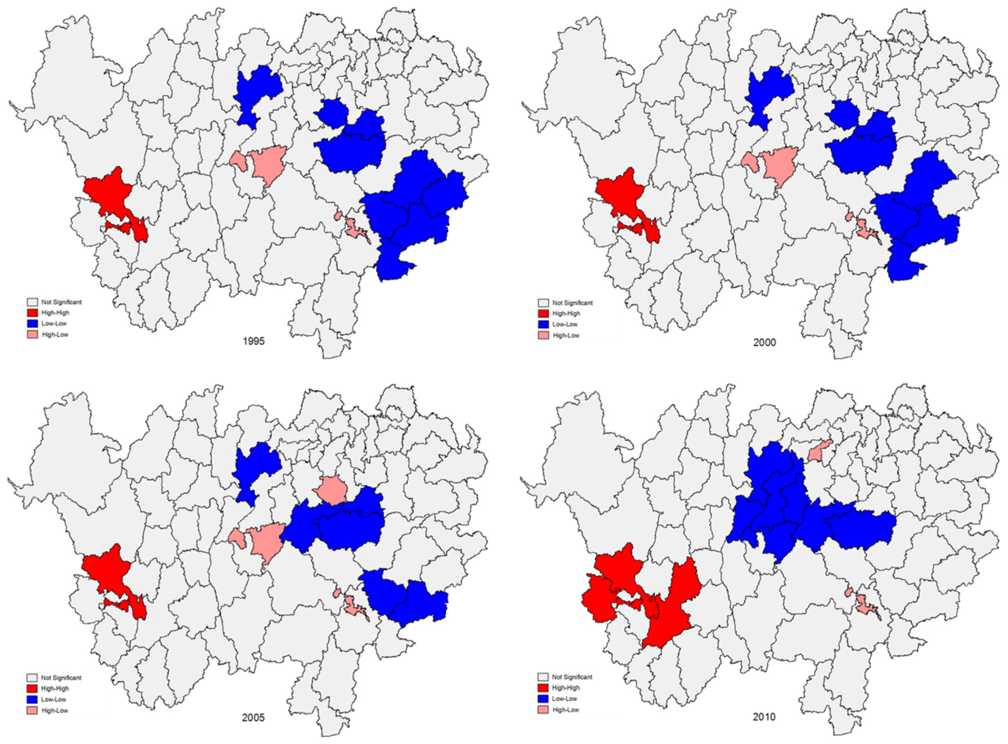 Figure 5 displays the Moran scatter plot of regional GDP per capita for 1995, 2000, 2005 and 2010. In the past few years, positive spatial autocorrelation has also been reflected by the slope of the regression lines. Table 4 shows that the major type of spatial distribution is an LL cluster, suggesting that the overall economic development is at a low level balanced state. Scatter plots distributed in the other three quadrants are lower and rather discrete, which means that regions with positive (HH, LL) and negative spatial autocorrelation (HL, LH) are small in number, and the disparities are big among them. It is also obvious that the agglomeration and the diffusion effects of economy are not very strong. Also, the degree of dispersion of data points in each quadrant is increasing especially in Quadrant. Furthermore, the number of HH regions increases and the number of LL regions decreases, illustrating that the agglomeration effect is strengthening.