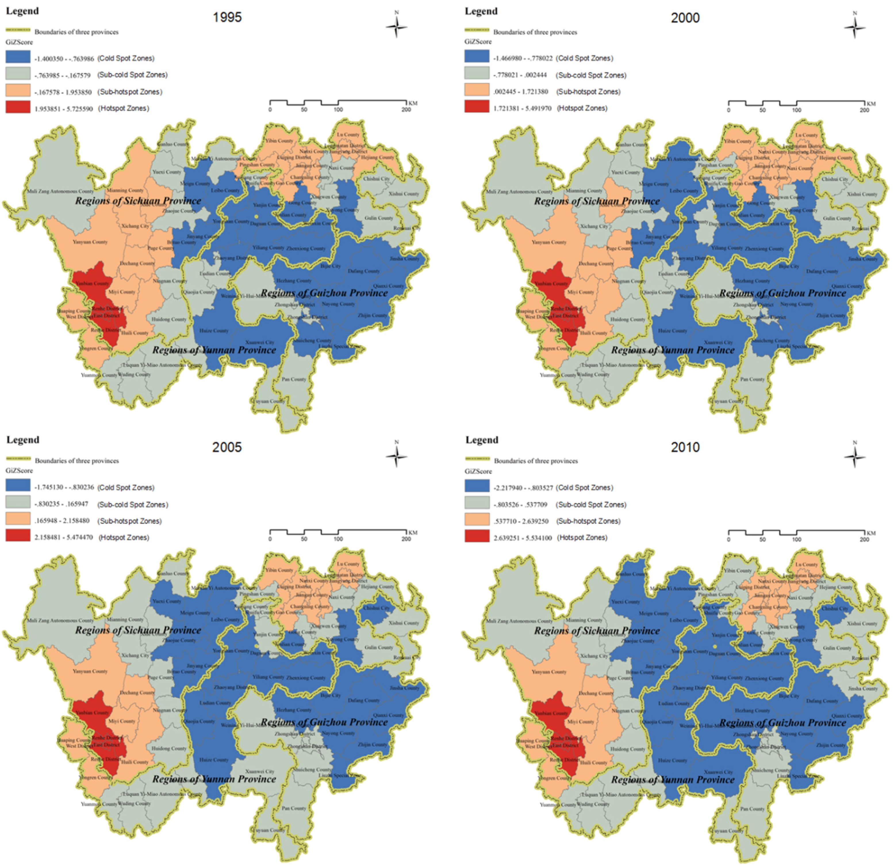 In terms of spatial structure, an approximate circle structure with two cores in the southwest and northeast is shaped by cold spots and sub-cold spots gathering together respectively, while the range of hot spot and sub-hot shrink over time (Figure 8). Specifically, sub-hot spots (if any), sub-cold spots and cold spots surround the two cores sequentially from the inner to the outer. The cold spots, between the two cores, tend to gather into a mass and seems to be a boundary of the two circles. Moreover, the southwest core located in Panxi region of Sichuan Province is always the hot spot of the IBRS, with the northeast core located in Hilly Sichuan Basin of southeast Sichuan. However, the broad area in the east and central, such as most of Zhaotong City, Bijie Prefecture, Da&Xiao Liangshan (one of China’s poorest regions) and Qujing City are almost always in the cold spot of low level of development in the study period.