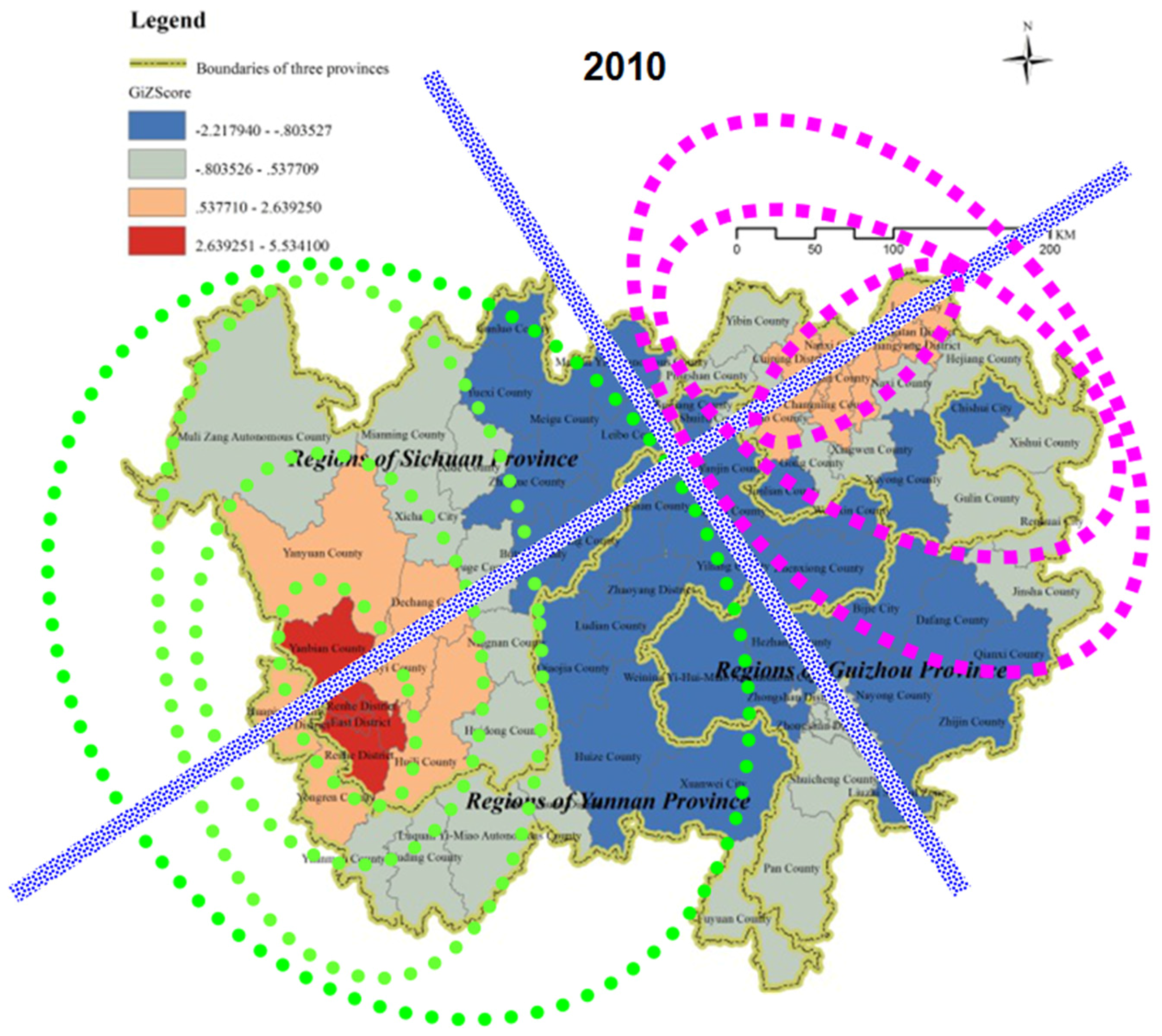 - Yu, H.; Liu, S.Q.; Guo, S.L.; Zhang, H.Q. Border effect of non-equilibrium economy in contiguous areas of Sichuan, Yunnan and Guizhou Provinces. Urban. Environ. Urban. Ecol. 2011, 24, 29–32. [Google Scholar]