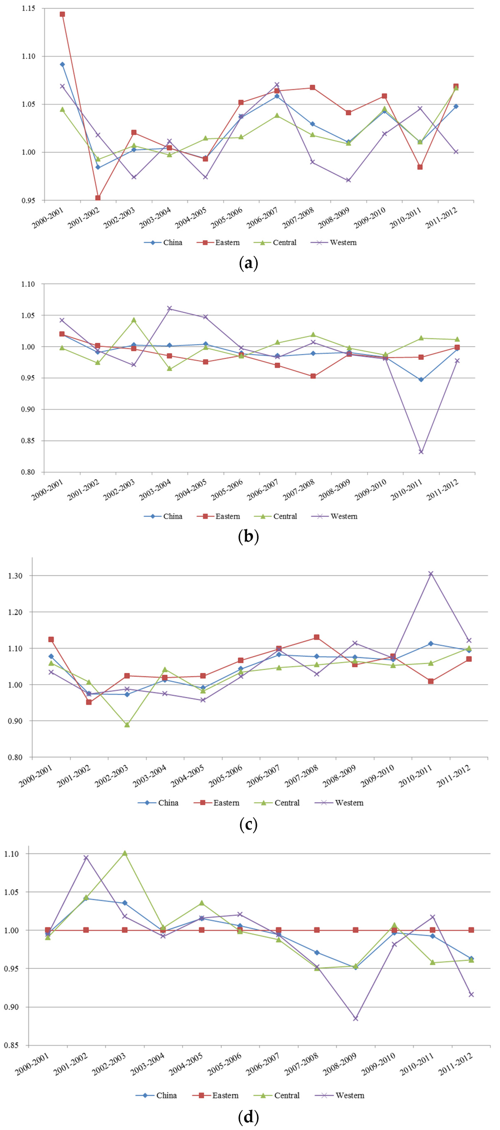 Essentially, constructs the best-practice frontier based on the observations for the specific group h only for that time period t. Based on calculated by Equation (5), the GDPI given by Equation (4) can be denoted as .
