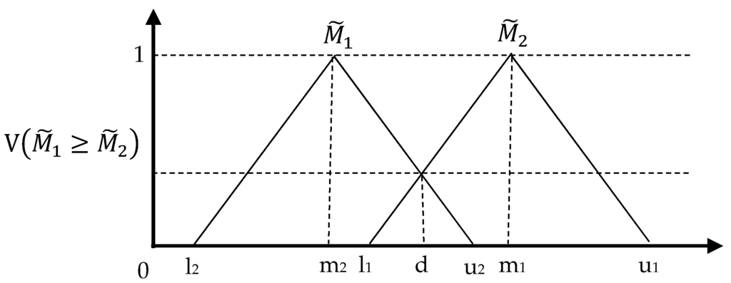 where is triangular fuzzy number that can be demonstrated by l, m, and u, which are values in which m represents the most promising value and l and u represent the smallest and the largest possible values, respectively. All the , j = 1, 2, 3, …, m are triangular fuzzy numbers (TFNs). The steps of Chang’s extent analysis are described as follows [34]: