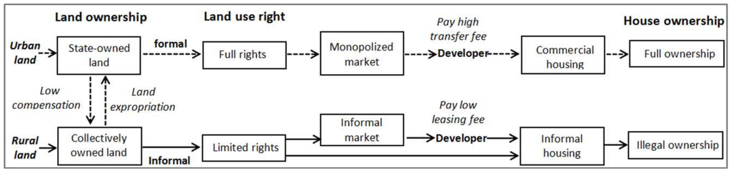 28]. It is widely believed that informal land development in China is largely affected by the dual urban–rural land system [
