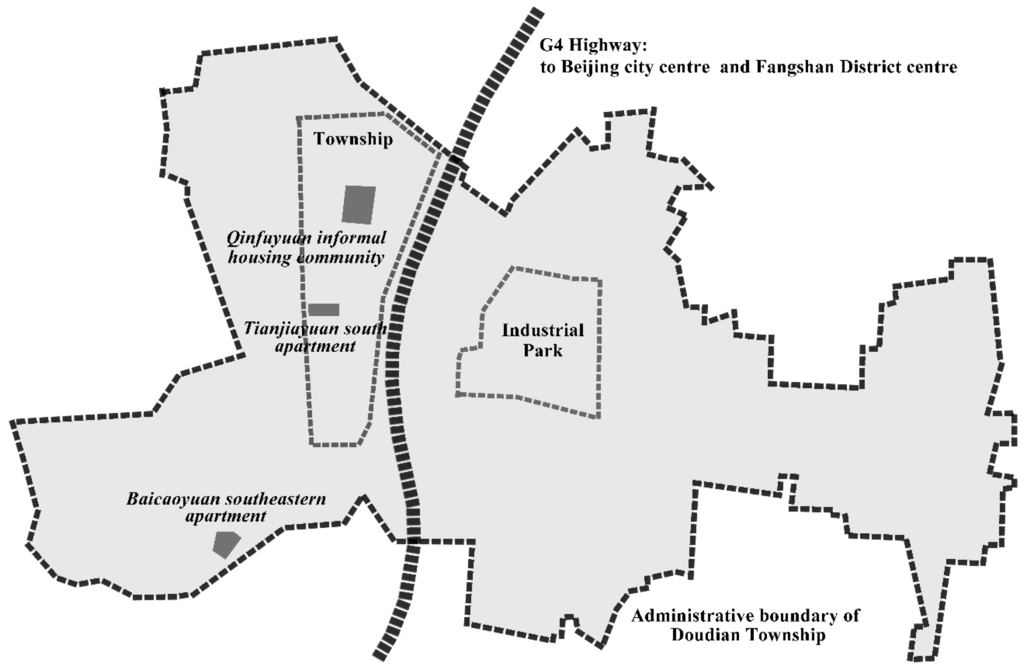 19]. In contrast, the study addresses the failure of the implementation of state government land development regulations in rural areas. The paper focuses on the roles of township government, villages and private developers in the context of the process of decentralization and marketization in China, looking at the specific case of informal land development in Doudian town in the rural area of the municipality of Beijing. Officials from the township government were interviewed for the purpose of the study. It is on the basis of these interviews that the communication and interaction between various levels of government and the conflict between state regulations and the township government’s responses to informal land development in villages under its jurisdiction will then be discussed.