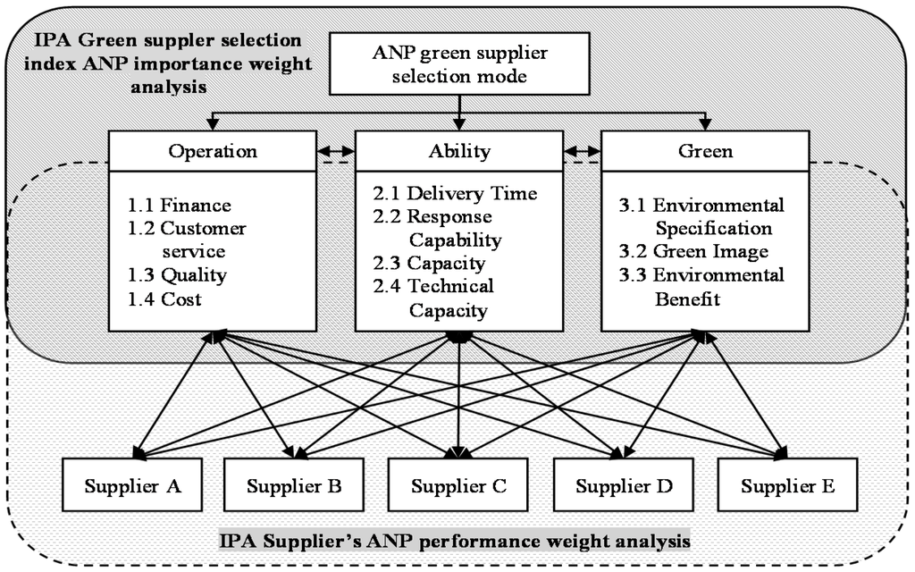 In conclusion, the supplier selection problem has been roughly solved. However, to respond to today’s complicated and changing environment, selection indexes are increasing in quantity and are mostly dependent on each other [45,46]. Therefore, in this study, the ANP that has dependency between indexes is utilized as the supplier selection tool [47]. In addition, based on ANP evaluation results, individual suppliers are further analyzed using the IPA concept to serve as improvement suggestions for supplier guidance and to achieve sustainable supply chain management goals.