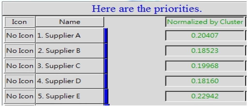 Each supplier’s performance in the case study company’s green supplier selection indexes is summarized and shown in Table 3, which clearly presents each supplier’s performance and emphasis in each index. Supplier A focuses on performance in environmental specification and green image (0.196, 0.163); supplier B focuses on performance in environmental specification and green image (0.232, 0.145); supplier C focuses on performance in green image and environmental benefit (0.197, 0.167); supplier D focuses on performance in environmental specification and environmental benefit (0.249, 0.166); and supplier E focuses on performance in green image and environmental benefit (0.293, 0.120).