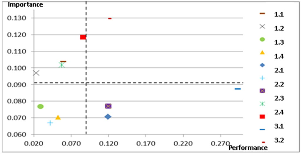 In conclusion, concerning multi-objective and multi-criteria decisions, when there are different options, the ANP is able to analyze the priority of each solution and tell the decision maker to select the best solution [45,47]. In addition, the ANP can be used in an importance analysis of enterprise performance indexes and as the basis of strategy implementation and resource allocation [75,76]. Therefore, in this paper, the ANP is used as a tool to select green suppliers with competitive potential. Moreover, in this paper, based on the analysis data in the ANP implementation process such as index importance priority ranking and each supplier’s performance level evaluation results for each index, a further analysis is developed with the IPA to provide an importance reference basis for subsequent supplier guidance and improvement suggestions.