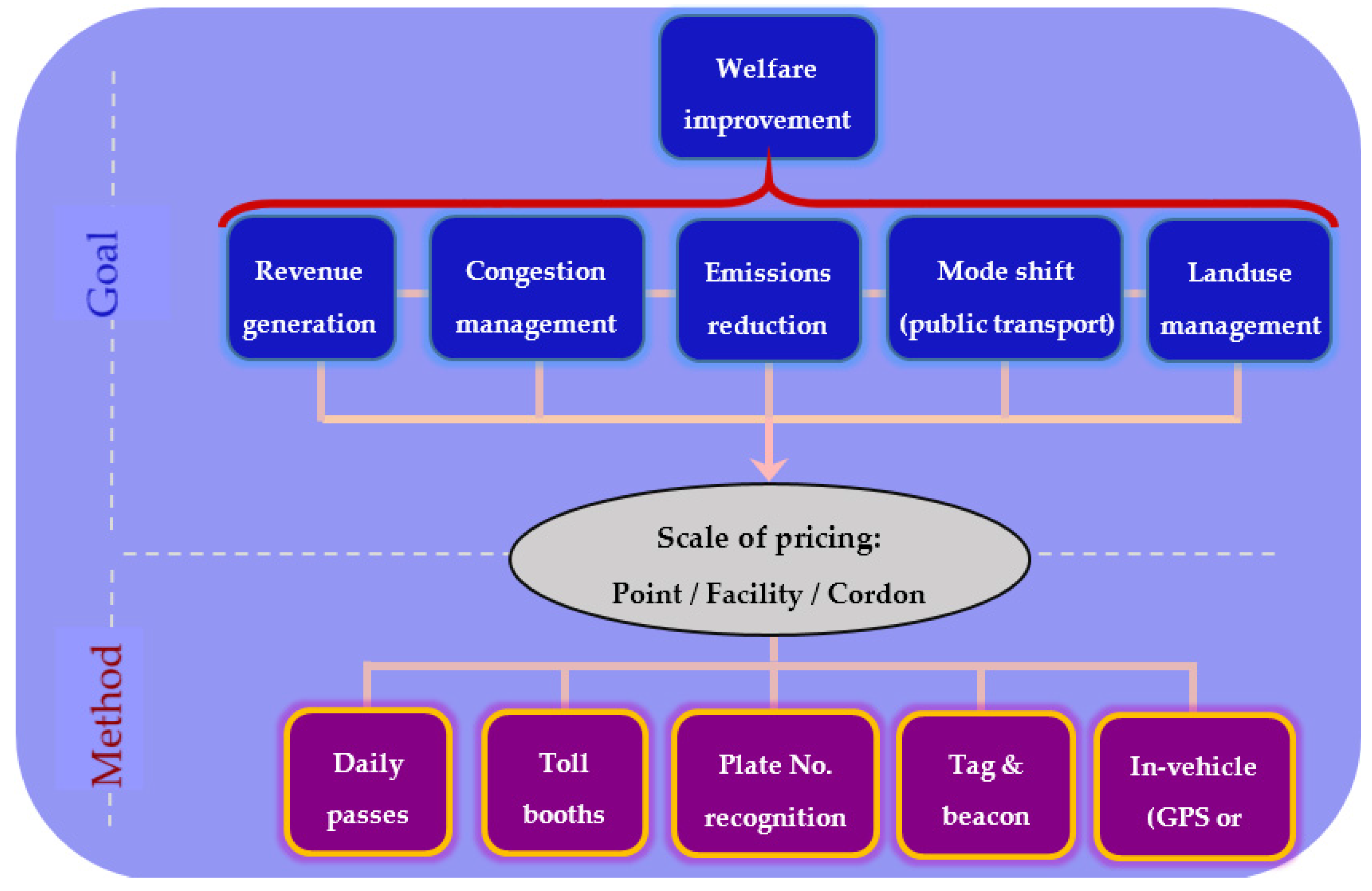 Two major goals drive the road pricing decision: revenue generation and congestion management [6]. However, several other objectives are pursued as well, including transportation-related emissions reduction (especially to meet conformity obligations) [11], public transportation use or mode shift encouragement [12], land use management [13], and social welfare maximization [14].