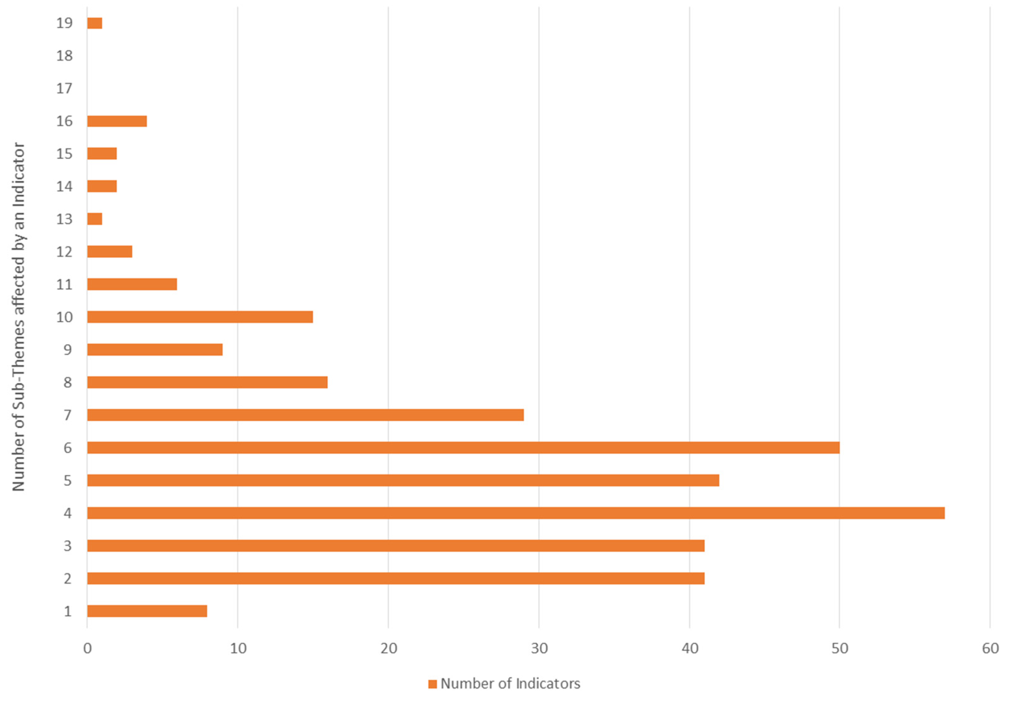 The selection and continuous refinement of the indicators lasted three years with different experts being involved at different stages of the process. Over the three years, different formulations of indicators and different minimum and maximum values and benchmarks were tested before the current versions were identified. Also many partly overlapping indicators were discarded over time. This procedure led to the selection of 327 indicators which are linked to 1 to 19 sub-themes of the SAFA Guidelines. On average 5.4 sub-themes are linked to one indicator. There are only eight indicators which are linked to just one sub-theme and 19 indicators which are linked to more than 10 sub-themes (Figure 2).