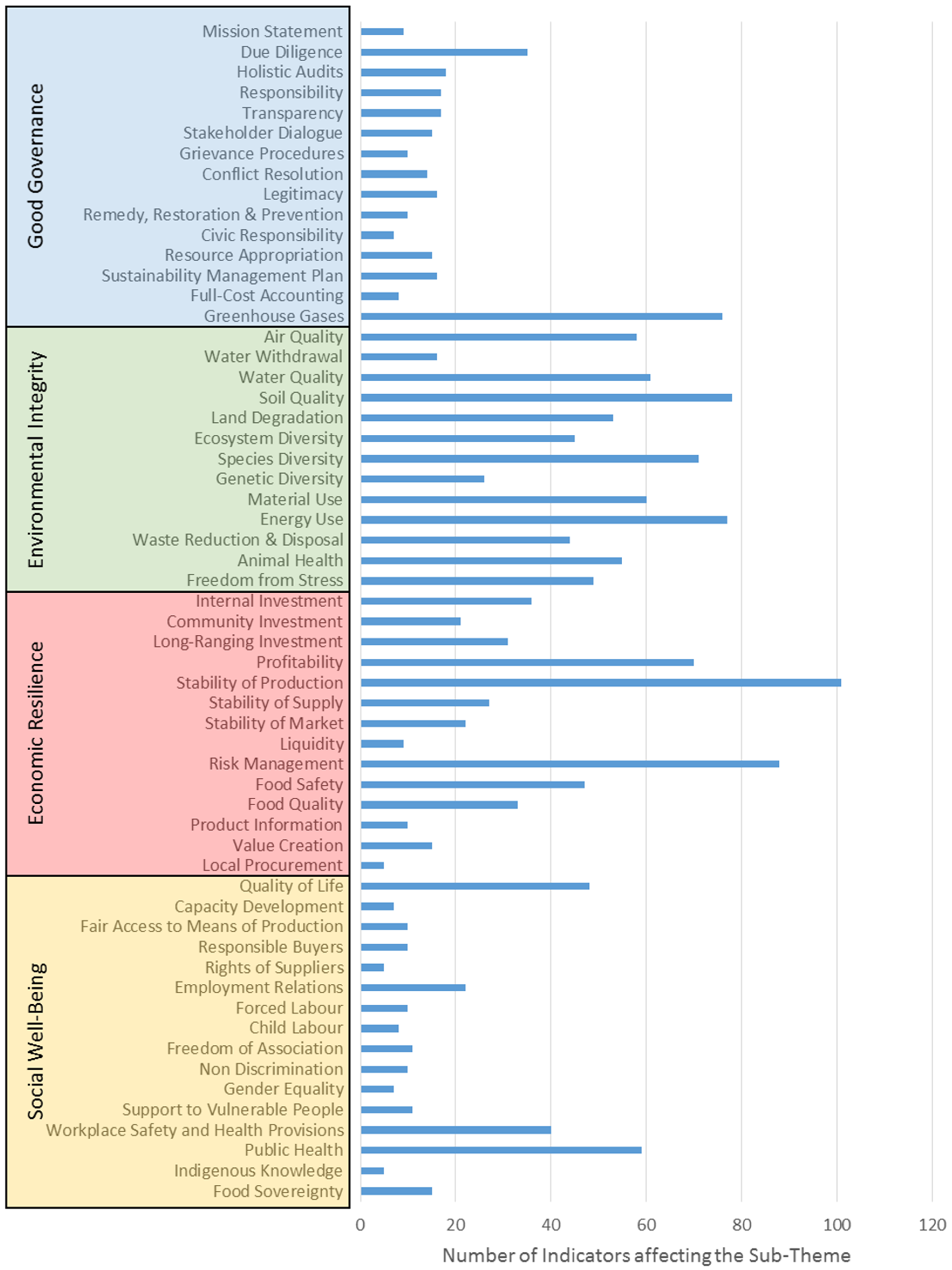 In total 1769 linkages between SMART indicators and SAFA sub-themes were determined. This means, there is an average number of 30.5 indicators per sub-theme (Figure 3). In the Supplementary Material A Tables S2–S59, all indicators and their applicability for each sub-theme are listed. The high variability of the number of indicators for each sub-theme resulted from applying the above-mentioned criteria. For some sub-themes, there is a large number of indicators relevant for influencing the degree of goal achievement (e.g., Species Diversity) while at the same time fulfilling the other criteria, for other sub-themes the degree of goal achievement can be verified using only a few indicators (e.g., Mission Statement).
