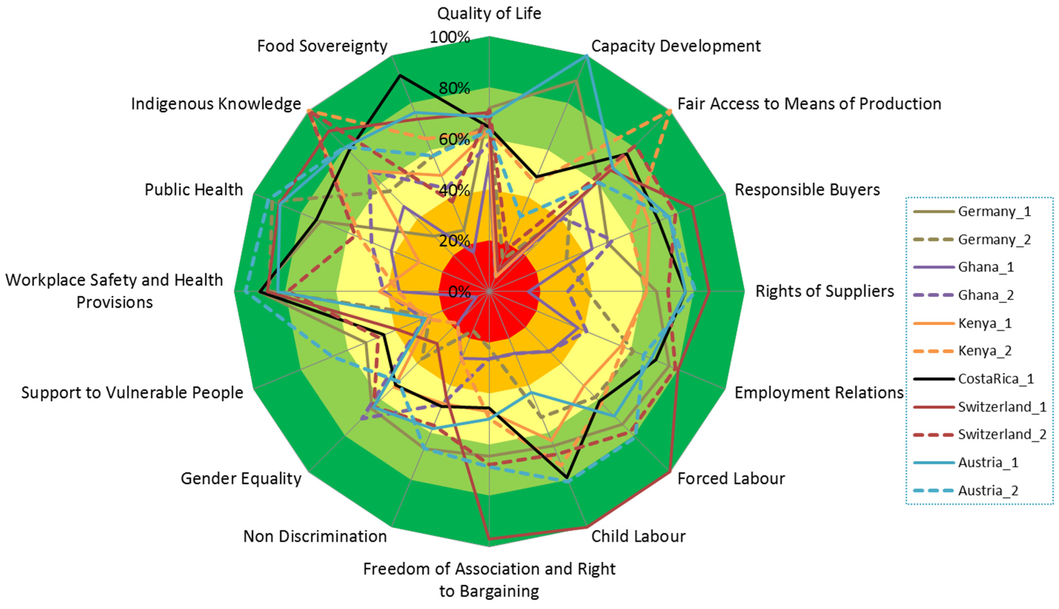 At the same time, there were farms in our sample which performed with 100% for Forced Labor, Child Labor, Indigenous Knowledge, Fair Access to Means of Production and Capacity Development. Very good scores, with more than 90% degree of goal achievement were also realized by single farms for Workplace Safety and Health Provisions, Public Health and Food Sovereignty. The lowest range of difference in the degree of goal achievement among our sample farms was for Quality of Life, while the highest range was for Capacity Development.