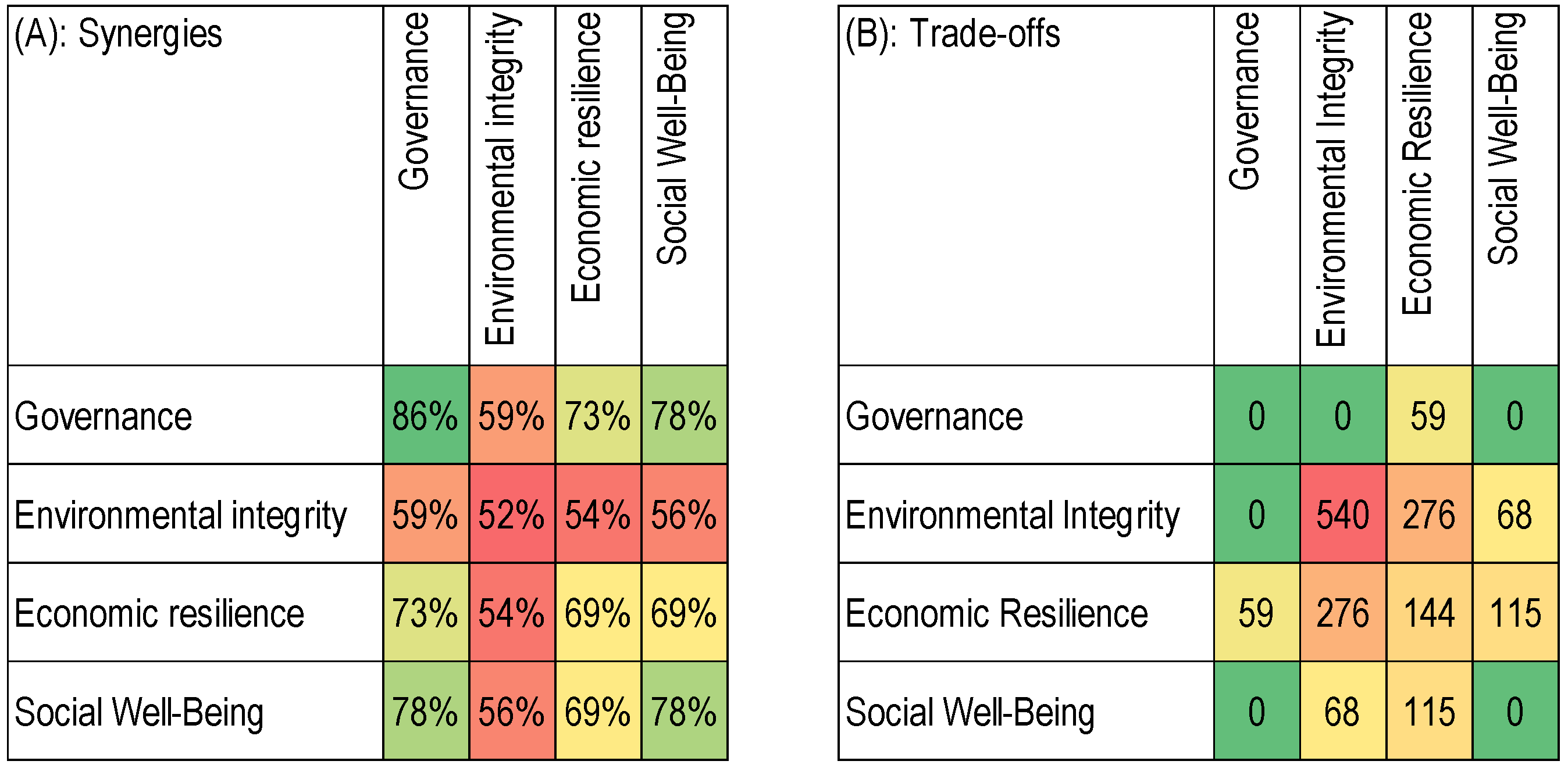 (A) Overview of synergies between sustainability dimensions. Green color indicates strong, yellow medium and red color weak synergies; (B) Overview of trade-offs between sustainability dimensions. Green color indicates absence of trade-offs, yellow medium trade-offs and red color strong trade-offs.