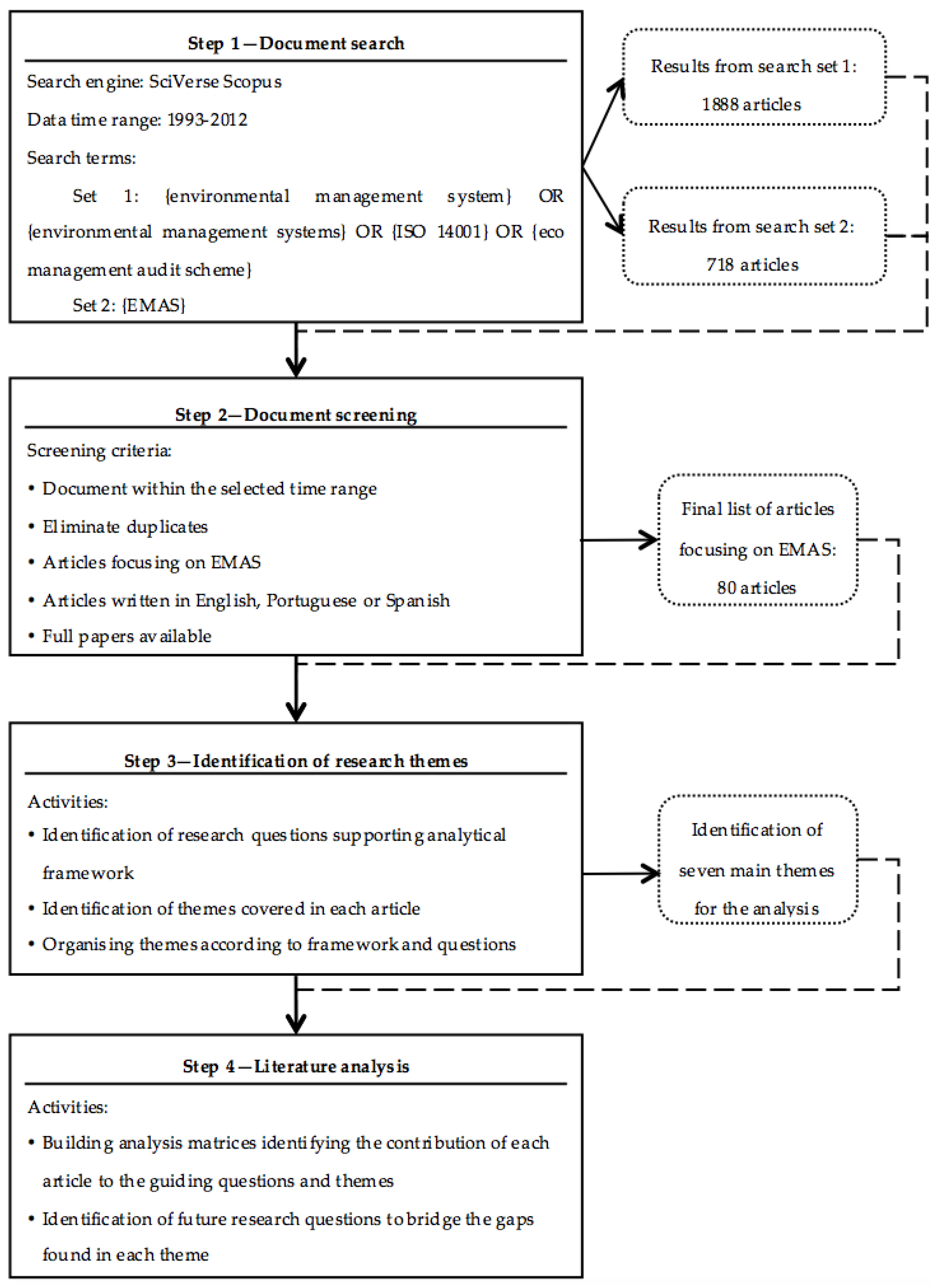 Throughout this period, several authors have been developing research to address conceptual, procedural and performance issues in EMAS uptake. Although many studies and guidance documents have been developed to support EMAS implementation [6], and reviews on other EMS schemes such as ISO 14001 have been conducted [7], to our knowledge, there has not been a comprehensive account of the EMAS research themes addressed in the published scientific literature. Thus, in this paper, we draw from an extended pool of articles published over the past 20 years, focusing on an integrated critical analysis of the main trends in research topics underlying EMAS, taking stock of key findings and subsequently outlining opportunities for future research.