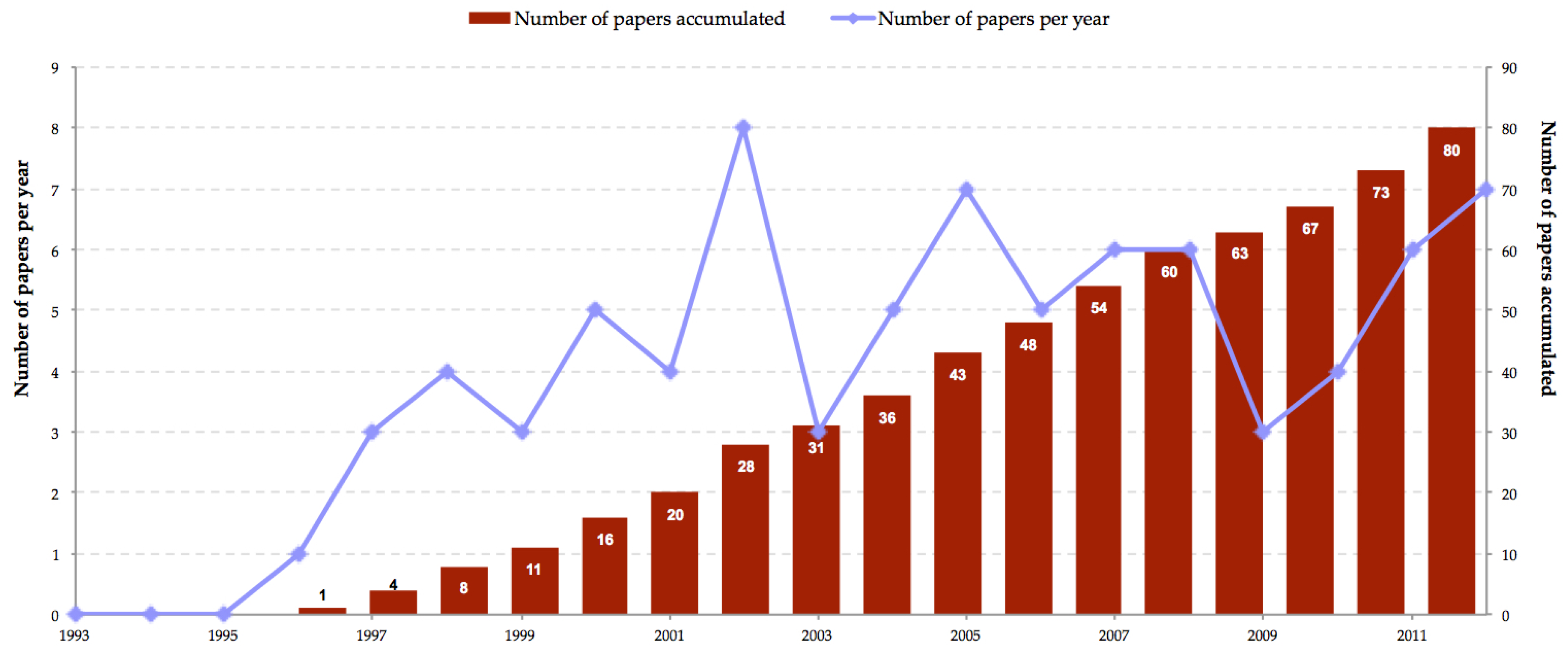 Evolution of the annual and cumulative number of articles in the reviewed set of publications.