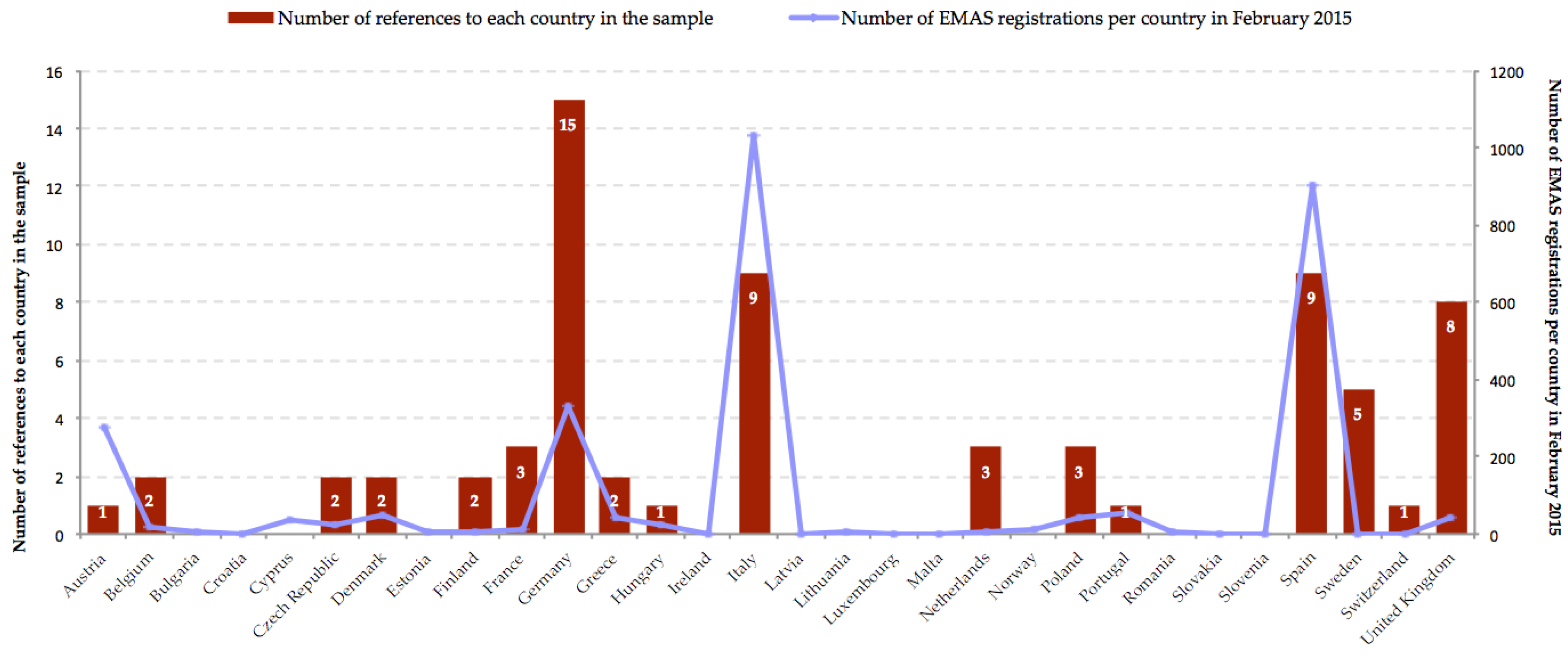 As for the geographical distribution of case studies referred to in the reviewed set of articles, the European countries with the most references are Germany, Spain and Italy (Figure 3). It is worth noting that these countries correspond also to those with a higher number of registrations in EMAS, as of February 2015 [8].