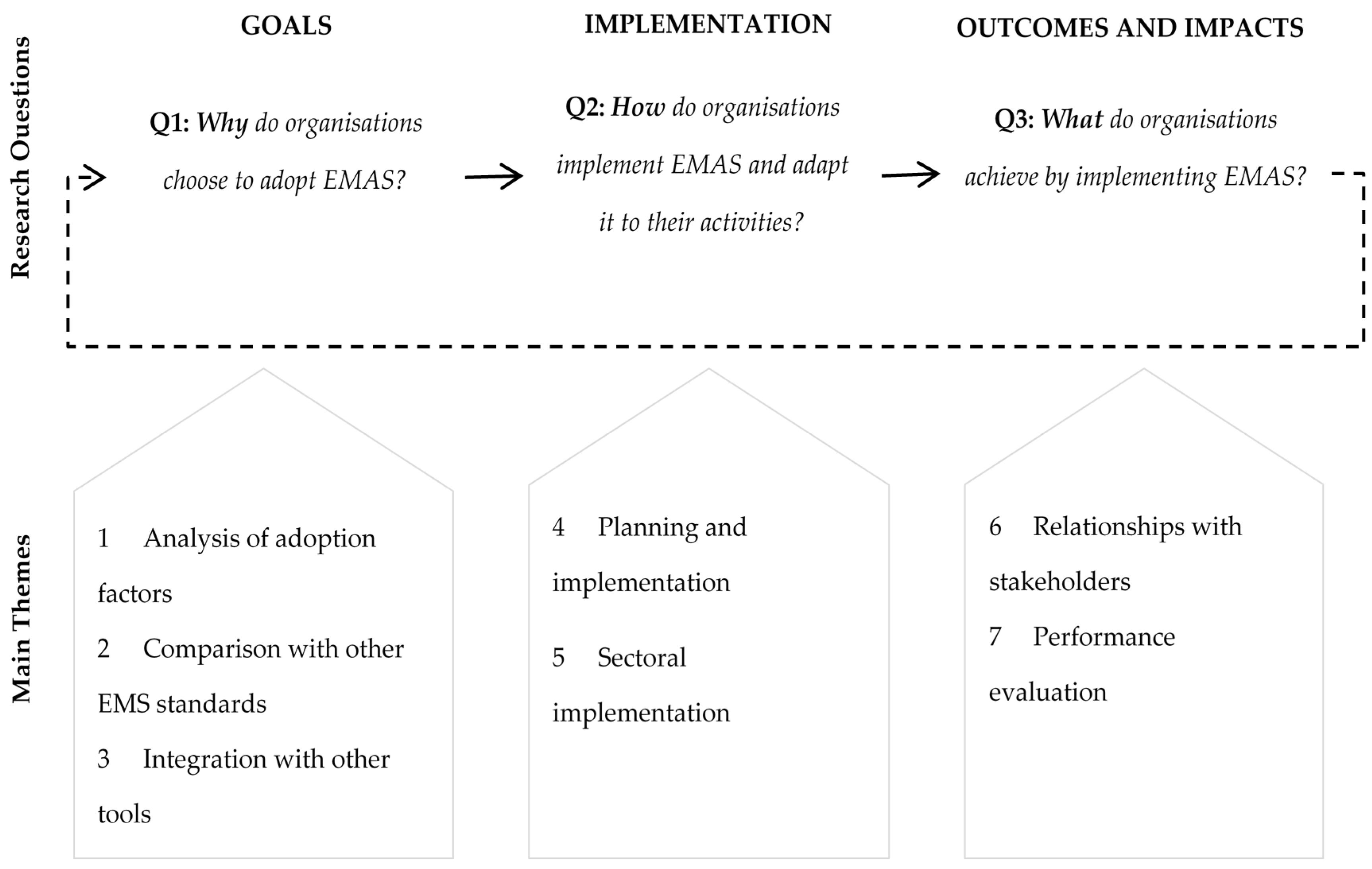 To proceed to the in-depth analysis and guide the literature review (Step 3, Figure 1), a framework was developed around three broad categories of questions underpinning the main objectives of our study (Figure 4). In the light of the three guiding questions, the scope of each article was identified through the analysis of proposed goals, results and conclusions. The analysis of the scope of each article provided information to elaborate an extended list of topics covered by the literature included in the sample. Subsequently, similar topics were clustered into broader themes and then these themes were assigned to the research questions, depending on whether they were addressing issues related with EMAS goals (question 1), implementation (question 2) or outcomes and impacts (question 3). Thus, seven main themes emerged from the literature to answer the proposed initial questions of the study, as illustrated in Figure 4.