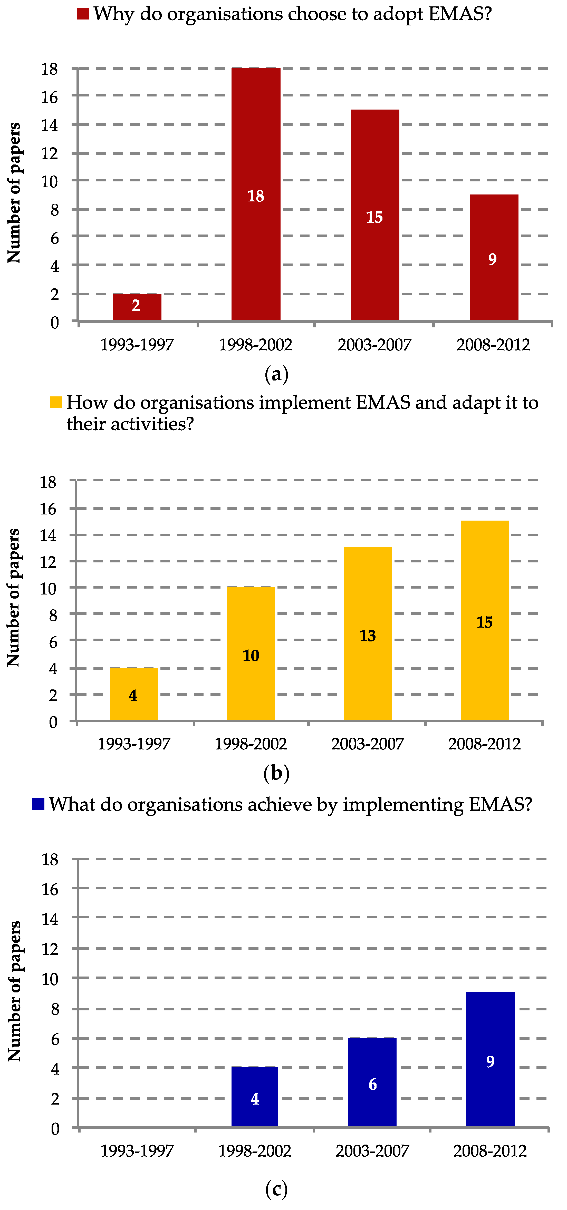 The classification process provided data to draw a trend in the number of selected publications according to each research question. Figure 5 shows that articles focusing on why EMAS is adopted dominated the concerns of scholars during the initial ten years of implementation of the scheme. Interestingly, these trends suggest that as the scheme matured and became more widespread, the focus shifted towards the investigation of operational issues and evaluation of outcomes from EMAS implementation.