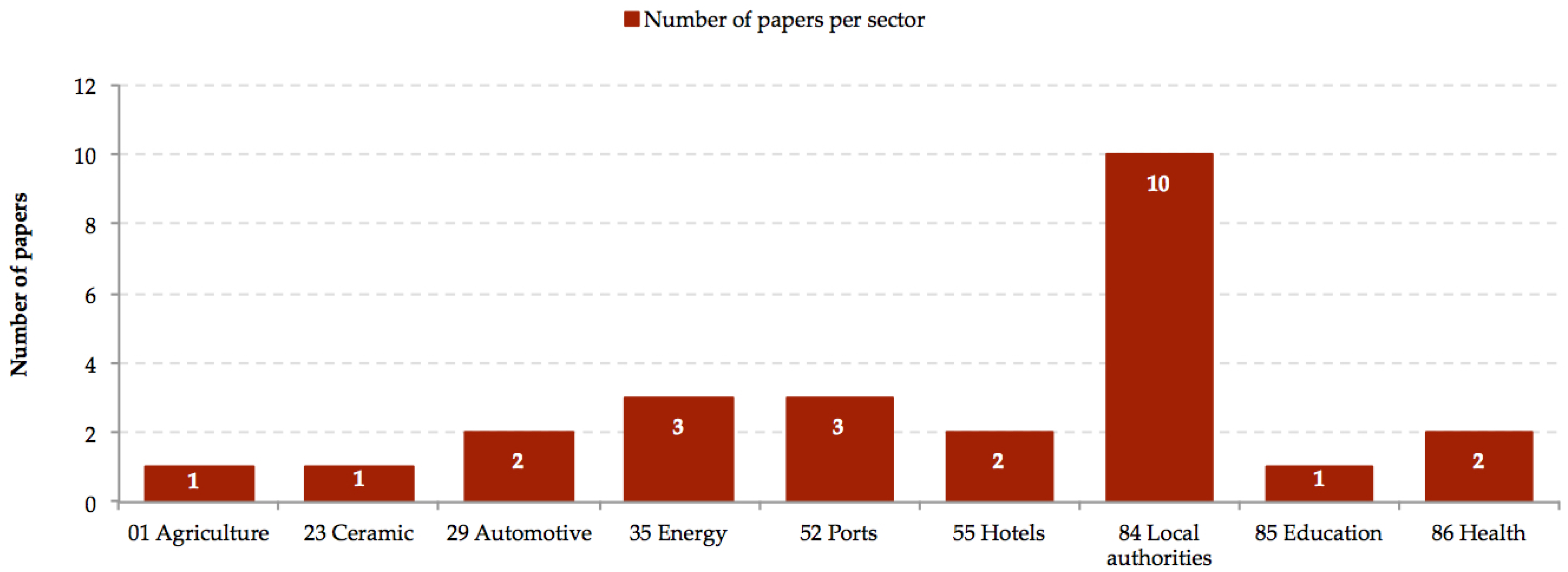 The policy relevance of sectoral studies resonates with the attention devoted to this topic in the scientific literature. Among all sectors, local authorities are the most studied organisations in the set of reviewed articles, followed by ports and energy production utilities. Figure 6 depicts the distribution of the number of references in the sampled literature across different sectors of economic activity.