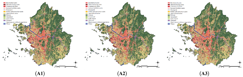The current study produced a total of six scenarios (Figure 9), three (1, 2, 3) of which pertain to the demand according to changes in population and industry, two (A, B) to supply/allocation considering the designation of preservation zones (areas where development is prohibited). Changes in land use were analyzed for each scenario.
