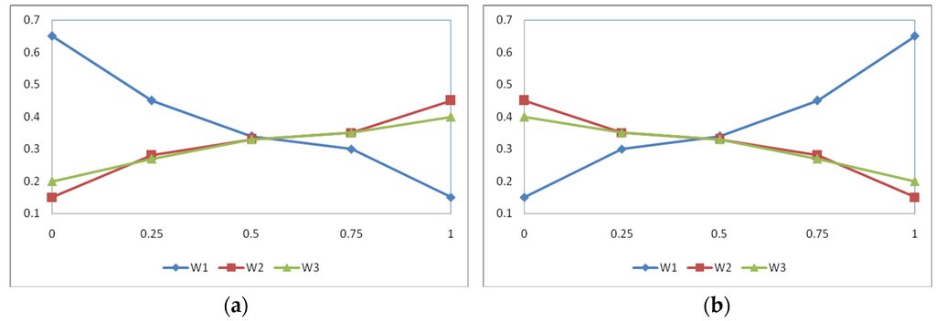 The above discussions suggests that and determine the weighting values of W1, W2 and W3. In other words, certain functional relationships exist between () and Wi. By considering the discussion in the previous sections, the following five assumptions are adopted to demonstrate the relationships between () and Wi.