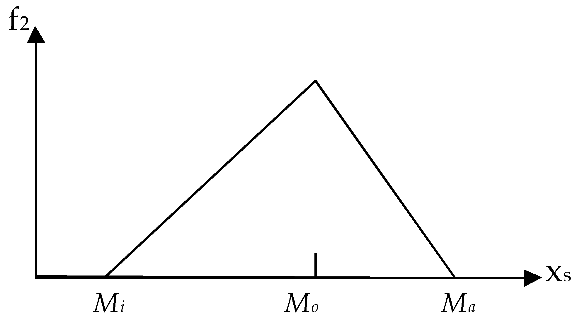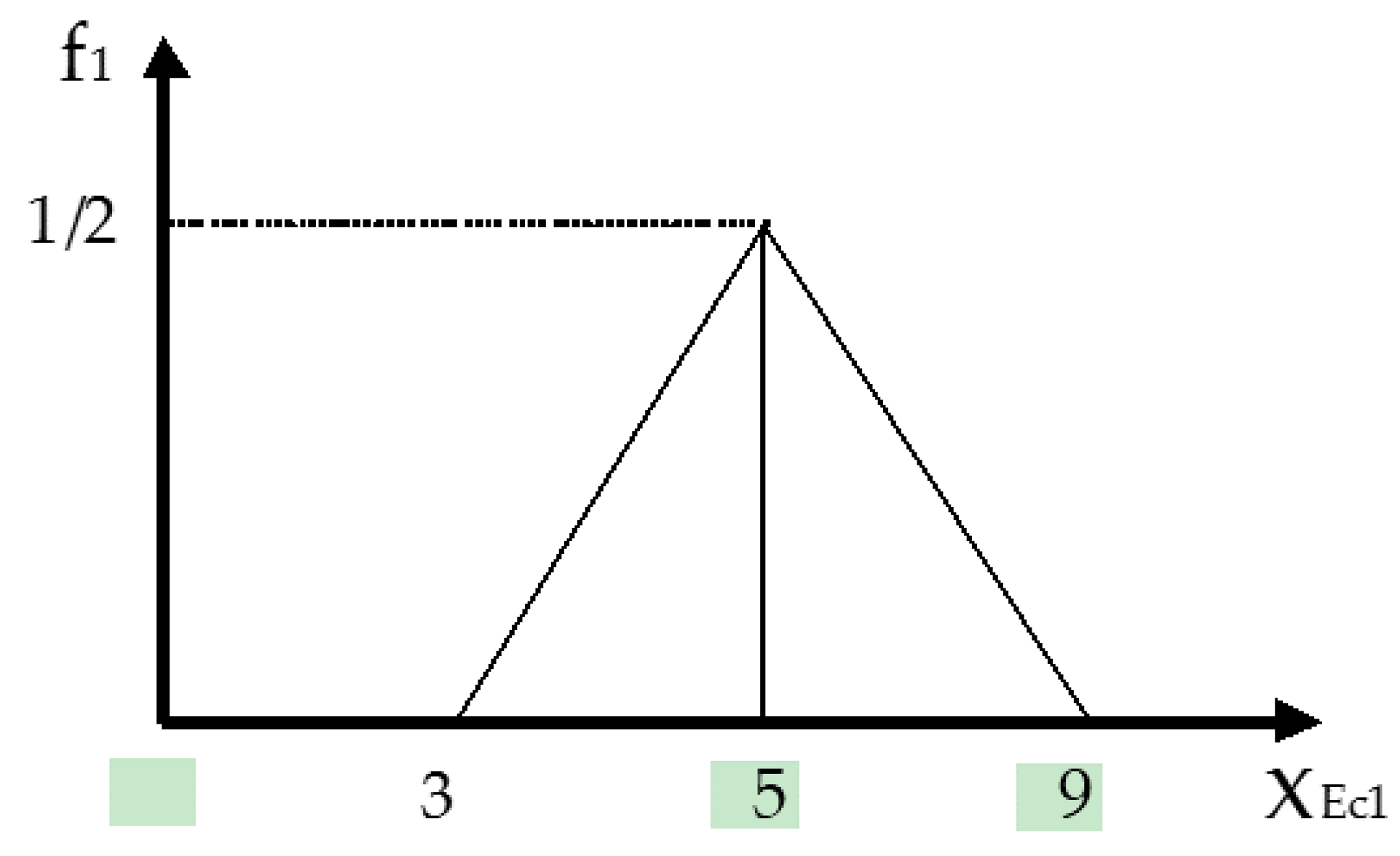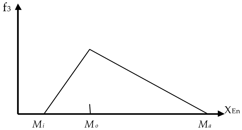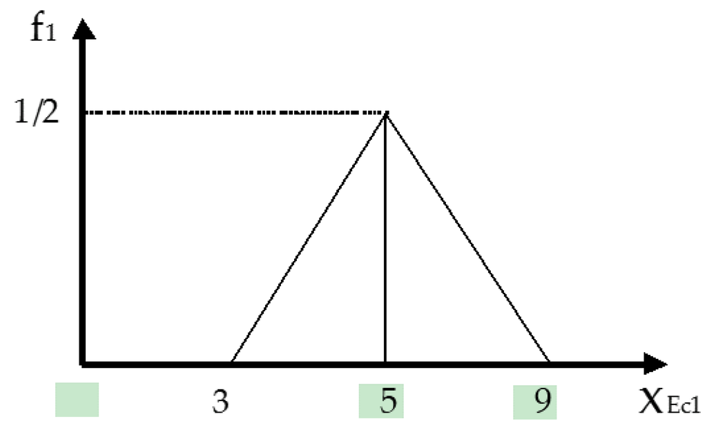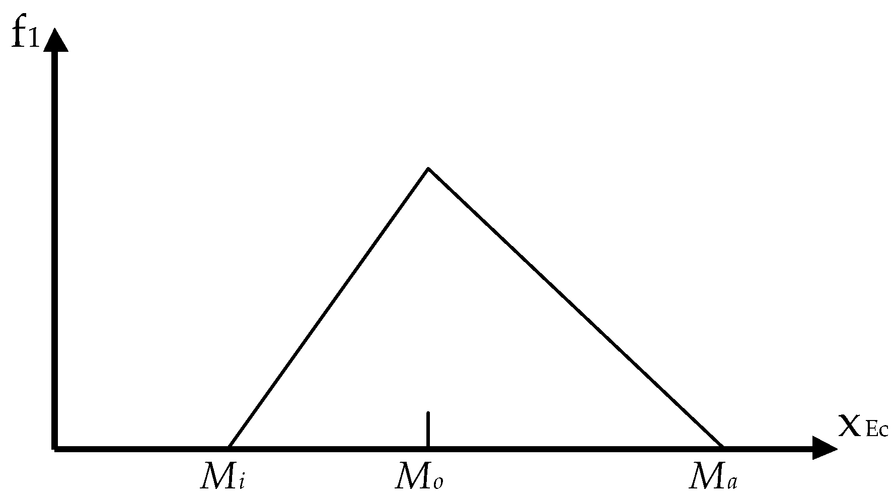 The generic Equation (5) can be applied to describing the probability density functions for the triangle probability distributions as shown in Figure 3, Figure 4 and Figure 5, which describe the distribution or experts’ perception on the sustainability performance score for economic, social and environmental dimensions. The sustainability performance values of Ec, S and En can be calculated by Equation (6).