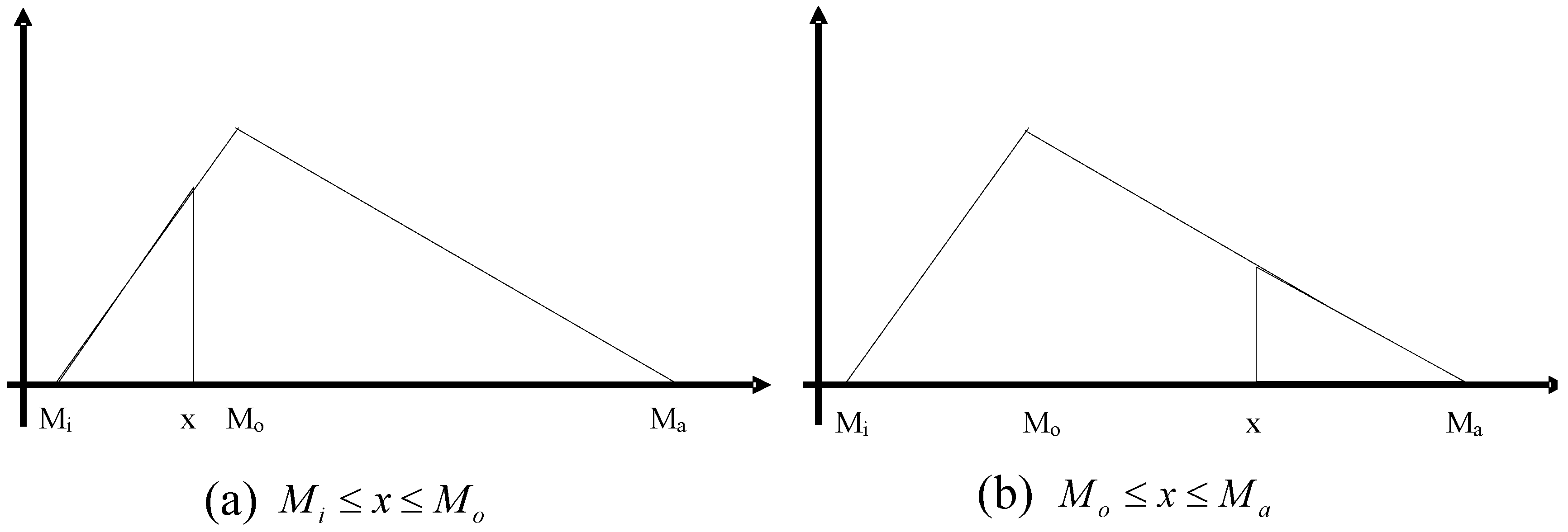 For further discussion, a general TPD is referred, as shown in Figure 6. According to the principle of probability density function that the total probability value is 1, the probability density function in referring to the triangle distribution Figure 6 can be derived by Equation (5).