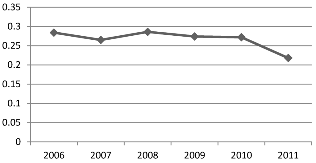 Average quantity of municipal waste per one resident [Mg]. Source: Author’s own study based on: Environmental Protection Report of West Pomeranian Voivodeship in 2006–2007: III Solid Waste Management, WIOŚ, Szczecin, 8, 2013 [15] (In Polish).