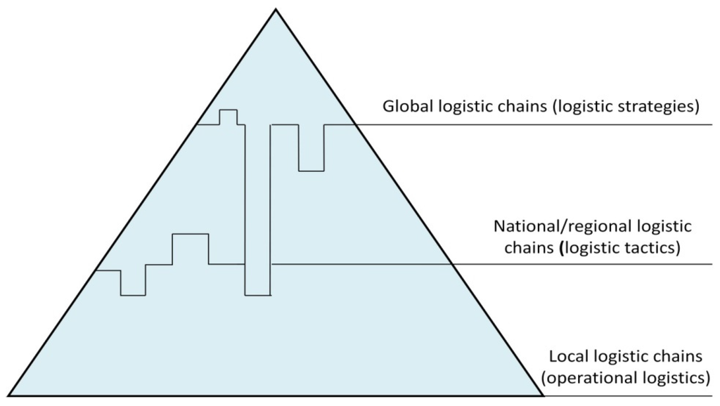 When accepting the application of the mechanisms of optimization and poly-optimization of logistic chains in the social aspect, one ought to indicate the need of a constant training and in-service training of producers and consumers as regards the methods and techniques of the formulation of goals, establishing of preferences and the value systems of a human (a group of humans), of quality assessment criteria and their weight etc. Understanding the place and role of a given human (a group of humans) in an economic system seems to be an essential strategic factor in this area. As it is indicated in Figure 4, the location of the place of logistic strategies on the global market is not unambiguous: we deal with a diversified permeance of three layers: strategic, tactical, and operational ones. However, in each case, in order to compete rationally on the market, a precise definition is essential of the vision, mission and goals expressed in quantitative and qualitative perspectives and so that it can be “processed” mathematically. The approach presented permits an optimization and poly-optimization of the management of ecologistic chains, their designing and improvement (the engineering of logistic processes), as well as an application of MCDM (Multiple-criteria decision-making) type methods. When possessing more and more perfected mathematical models that are supported by the dynamically developing IT sector, one may believe that the occurring non-linear limitations and discontinuities in logistic processes and chains will not cause any increase of the level of risk in relation to the determination of the goal path trajectory (a goal bundle).