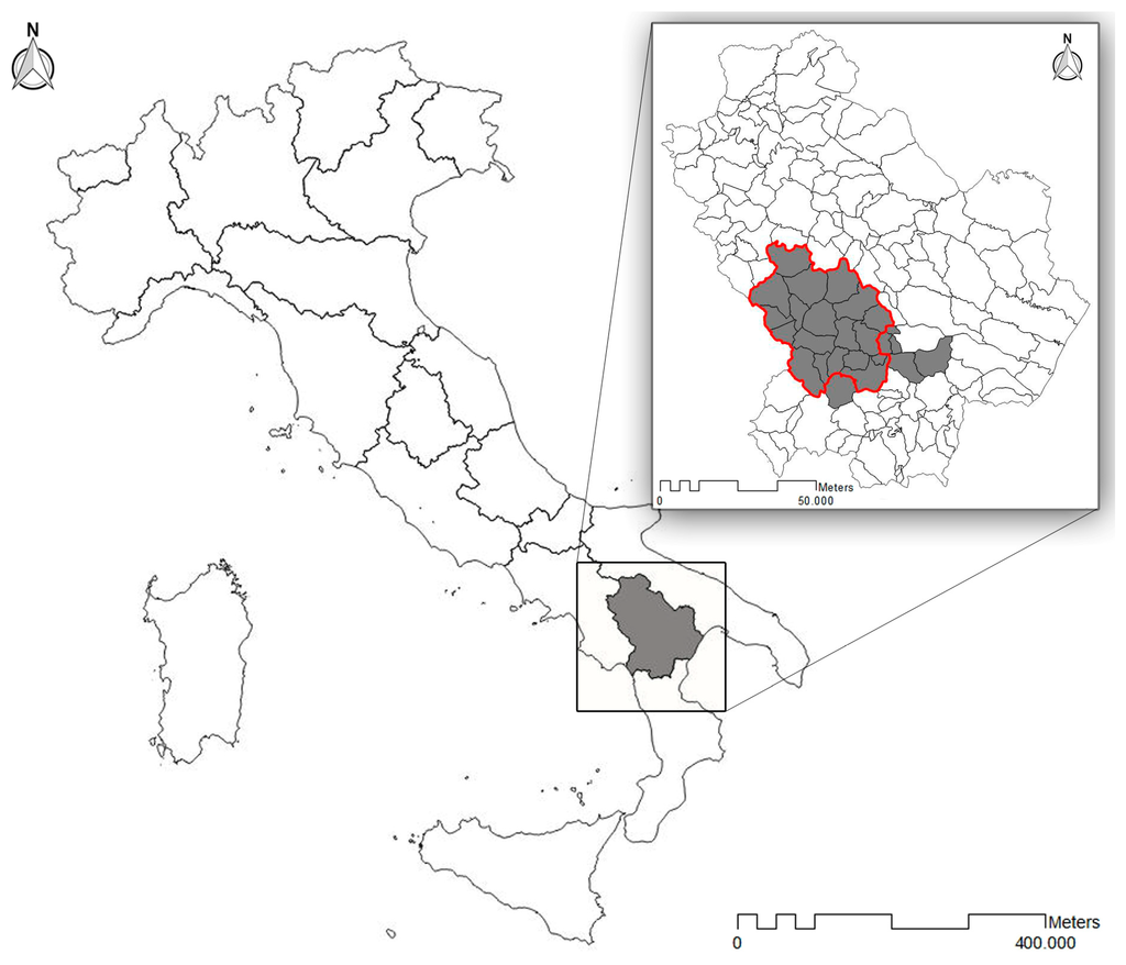 Thus, a homogenous morphological and socio-economic area comprising 18 municipalities (Figure 2) was considered (Abriola, Armento, Calvello, Corleto Perticara, Grumento Nova, Guardia Perticara, Laurenzana, Marsico Nuovo, Marsicovetere, Moliterno, Montemurro, Paterno, San Chirico Raparo, San Martino d'Agri, Sarconi, Spinoso, Tramutola and Viggiano). The municipalities analyzed are connected differently to the main road cutting through the valley, which is the main axis of road mobility.
