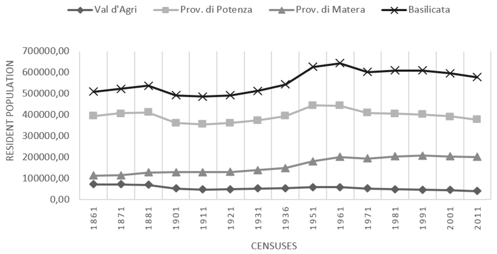 When compared to the general socio-economic context of Basilicata region, the territory of the Agri Valley is characterized as a region with a high potential, but still facing a difficult development. Historically, the structure of the economic system of the Agri Valley is based on the agro-forestry sector. Actually, in 2012, farmland companies represented approximately 32% of the total, followed by commercial (25%) and tertiary (21%) sectors [17]. However, we have to note that these are usually small and medium size business companies, underlying that this sector, although being important, is still scarcely industrialized. Conversely, the industrial sector is strongly connected with mining and oil industries. Even if the number of companies was not large, the number of employees in 2012 was very high [18]. The demographic profile of the Agri Valley (Figure 3)—which for completeness is discussed here in its entirety—counts a resident population of 51,906 inhabitants, about 9% of the regional population. The population density, 34.5 inhabitants/ km2, is below the average parameters of Basilicata Region (57.3 inhabitants/km2). National Census data, analyzed starting from 1861, show, in most of the municipalities of the study area, a population decrease with a similar trend to most of the municipalities of Basilicata Region.