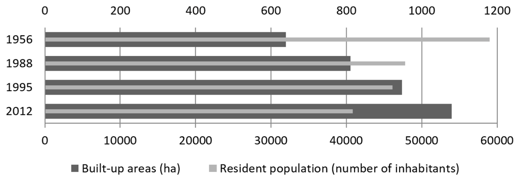 This drop in the number of inhabitants living in the area corresponds to a steady increase in built-up areas. An analysis of the historical evolution of the various settlements in the area shows how they have taken even larger dimensions over the years (Figure 5).