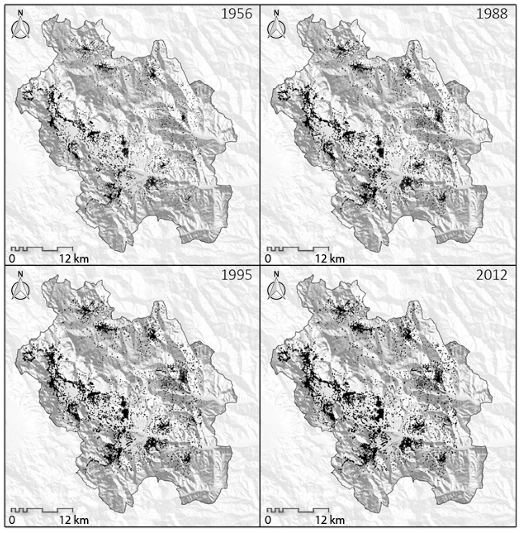 The analysis of the evolution of the settlements (Figure 6) shows that the greater increase in urbanization was experienced in the area at the bottom of the valley rather than in mountain areas.