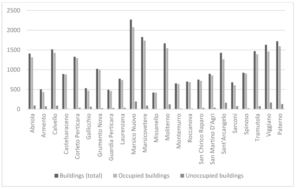 Total buildings, occupied buildings and unoccupied buildings in the Municipalities of the Agri Valley.