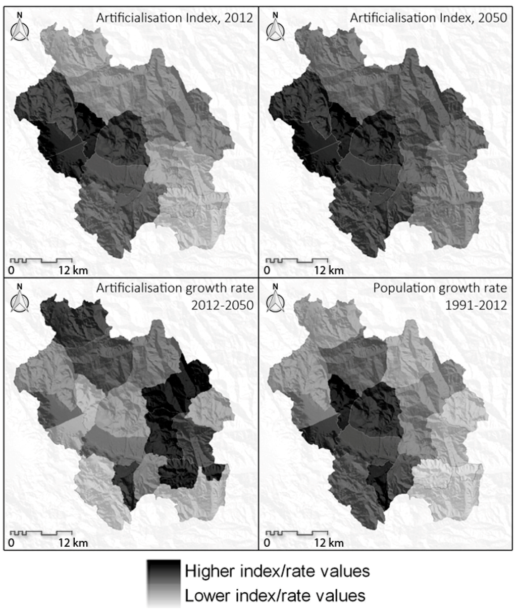 The literature suggests several methods for the evaluation of the spatial variations of the resident population and built-up areas within a territory [17]. This paper will use two indicators: the artificialization rate and population growth rate [39].