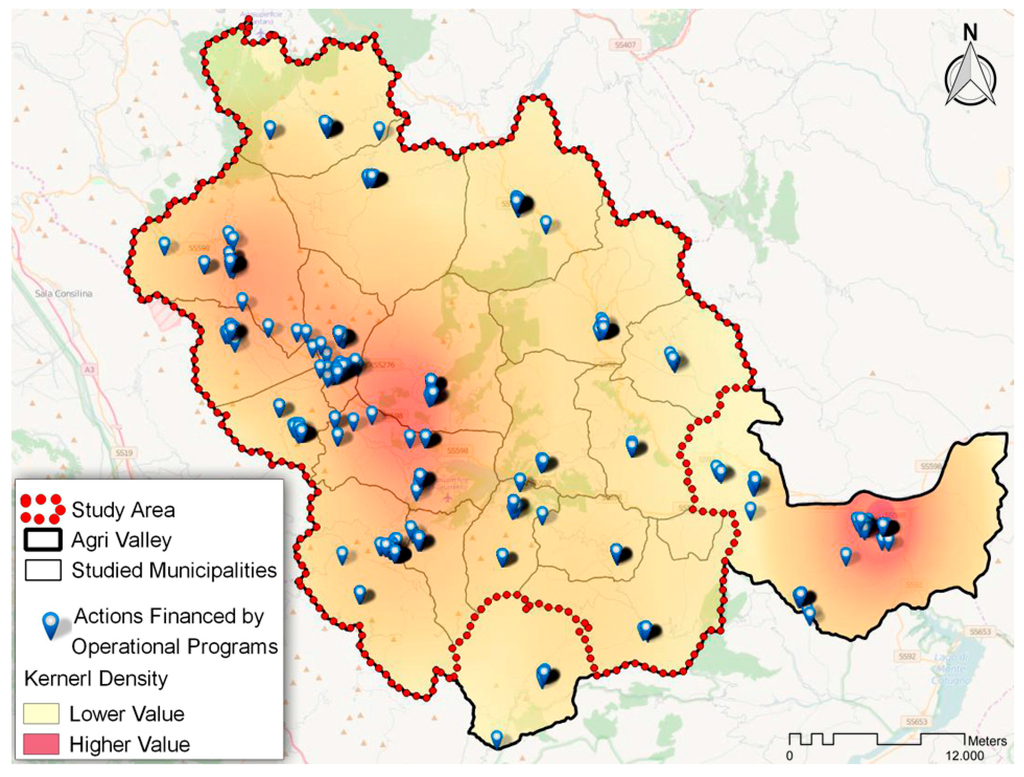 The western part of the Valley appears to have both in 2012 and 2050 the higher Artificialization Index. In the same area it is also evaluable the biggest value of the Population growth rate. The simulation results showed a significant urban growth also in the eastern part of the Valley; this justifies the high values in area of the Artificialization growth rate. The highest values of the index of artificialization in the western area can be explained with the observation of the investments made through the European Fund developed using data from the project Open Coesione (Figure 12). These show that the majority of investments have occurred in the same part of the Valle affected by higher levels of soil consumption. Geolocating Open Coesione data, it was possible to calculate a kernel density [51], using as intensity the amount in euro of funding for each single action. The result shows that the Municipality affected by the higher density values are Marsiconuovo, Marsicovetere, Viggiano and Grumento Nova.