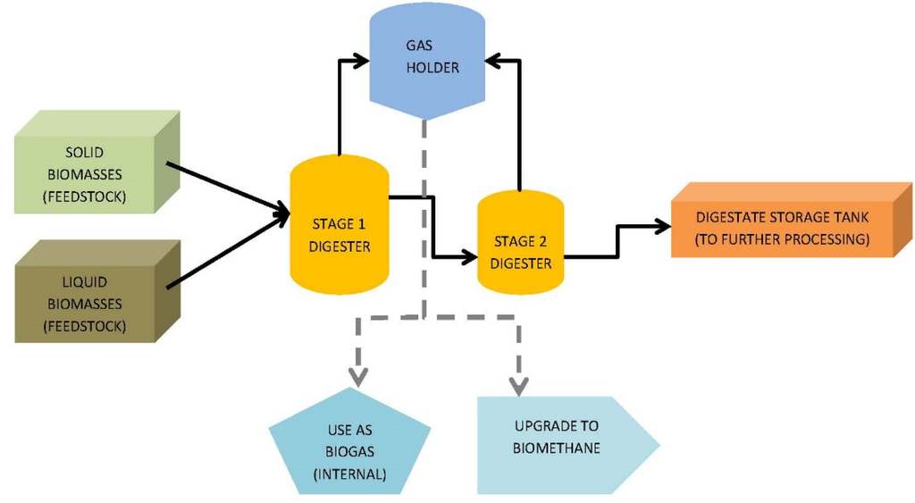 A typical anaerobic digestion biogas generation plant may look like the one schematized in Figure 1. It is beyond the scope of this paper to enter into the details of these systems, as several review papers on this topic have been already recently presented in the literature [12,13]. These plants are traditionally used for processing the substrates mentioned previously with excellent levels of consistency, although some operational drawbacks are still reported (most commonly, odor generation) [14].